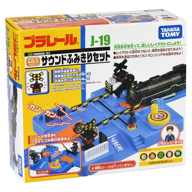 プラキッズとサウンド踏切りセットのです!ダイアルを回すとプラキッズが、踏切を横断します。電車が通過するとリアルになった踏切警報音が鳴り、遮断機が降ります。中央の道路部分でトミカで遊ぶことも出来ます。サウンドは2種類。