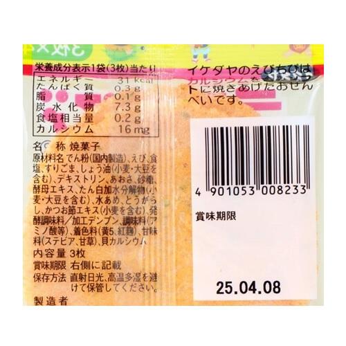 でん粉(国内製造)、えび、食塩、すりごま、しょう油(小麦・大豆を含む)、デキストリン、あおさ、砂糖、酵母エキス、たん白加水分解物(小麦・大豆を含む)、水あめ、とうがらし、かつお節エキス(小麦を含む)、発酵調味料/加工デンプン、調味料(アミノ酸等)、着色料(黄5、紅麹)、甘味料(ステビア、甘草)、貝カルシウム