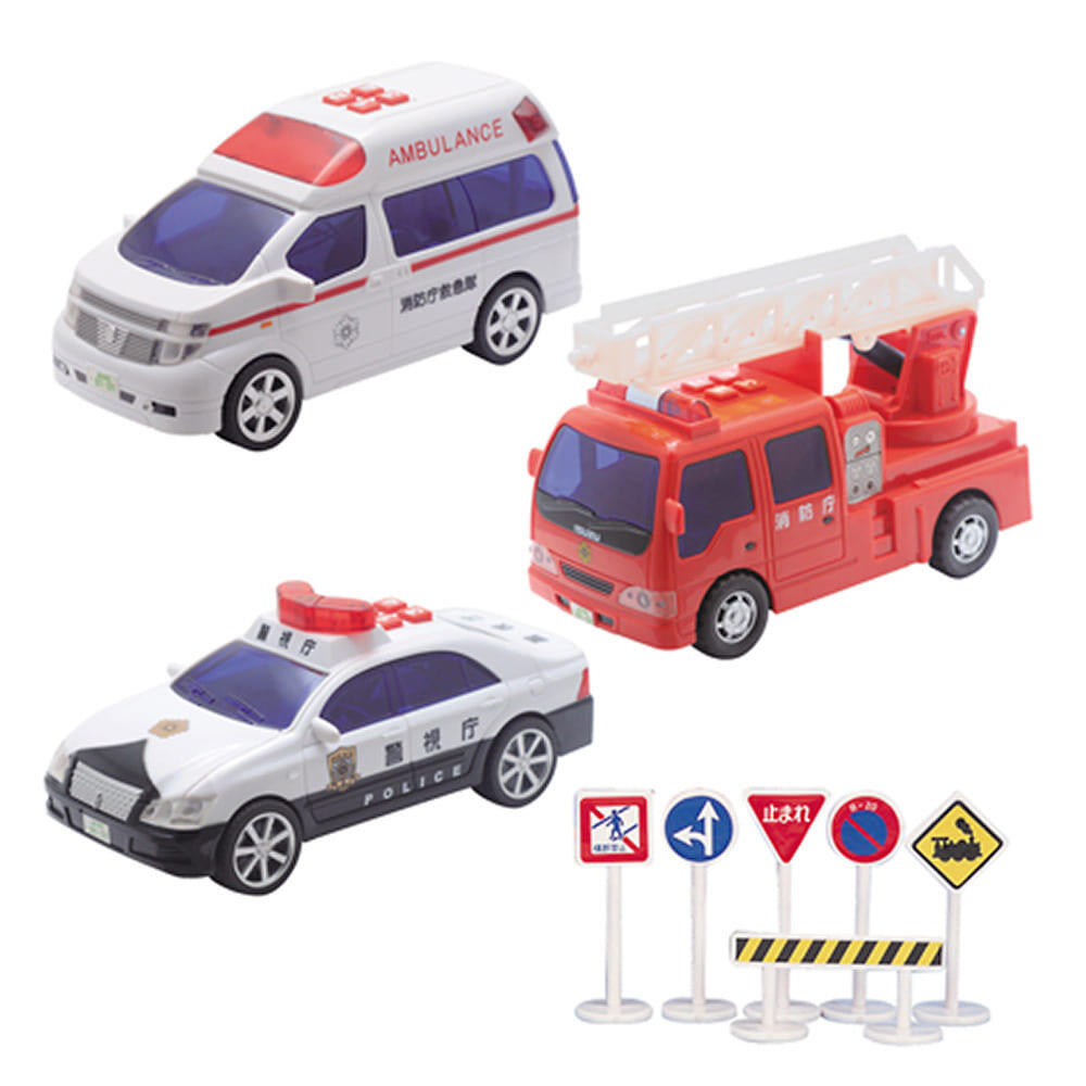 ミニサウンド 緊急車両セット 3台セット フリクション走行 パトライト パトカー 救急車 消防車 標識セット付 トイザらス限定 クリスマスプレゼント 3歳 4歳 5歳