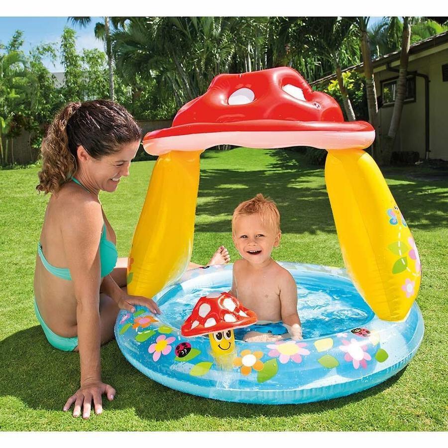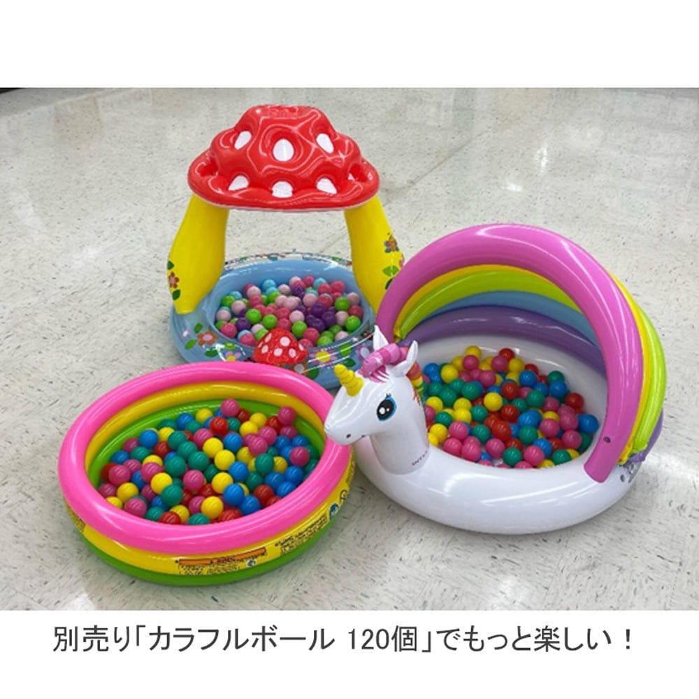 屋根付きのマッシュルームベビープール。柱の数が減り、より遊びやすくなりました。クッション式フロアなので床が柔らかいです。別売りのボールを入れるとボールプールとしても楽しめます。