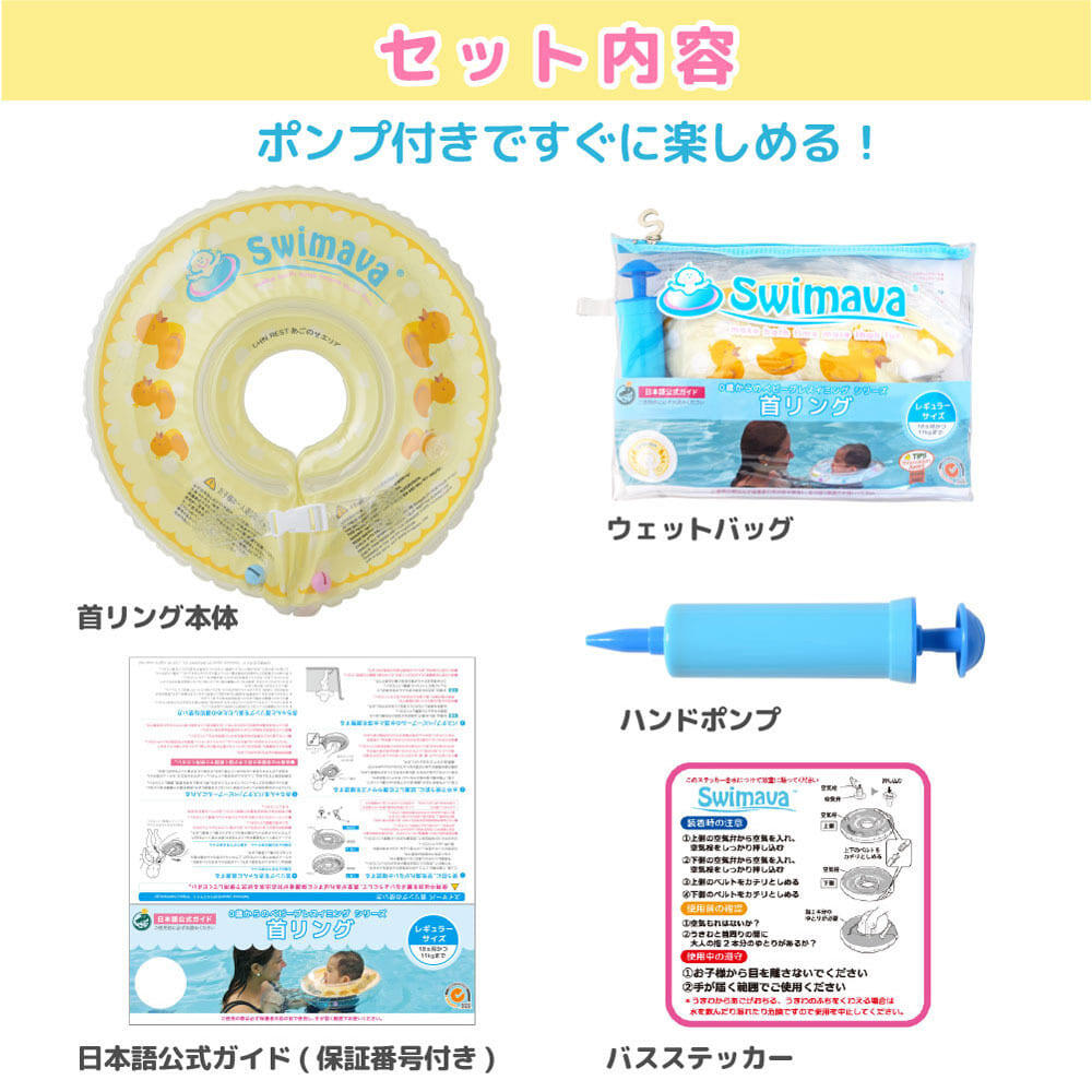 <セット内容>うきわ首リング、空気入れ、日本語公式ガイド、お風呂ステッカー