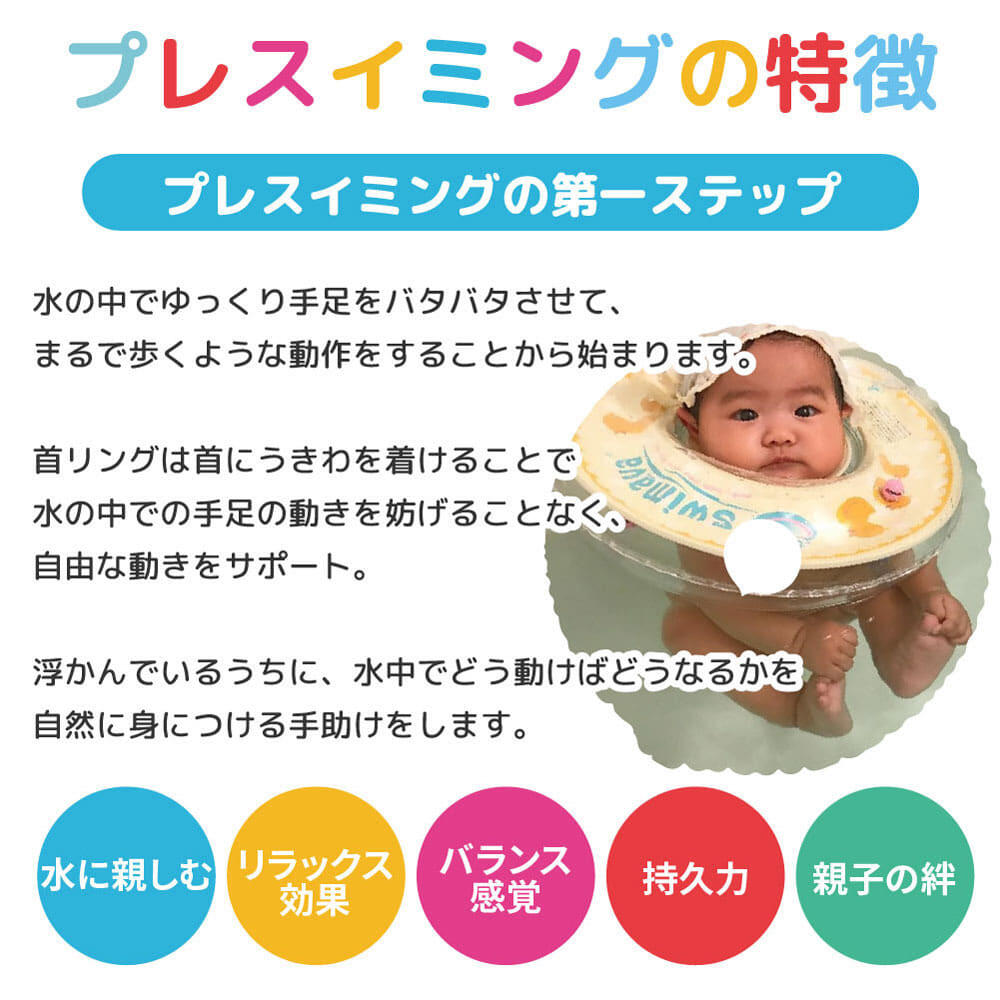プレスイミングとは、水に浮かぶ事から始まり、羊水にいた頃の記憶を忘れないうちから手で水をつかむ感覚、浮いている感覚、水に浸かっている感覚に親しみ、水への抵抗感や恐怖感をぬぐいさること、水中でのバランス感覚や心身ともに感覚を刺激することで好奇心を促す事につながります。