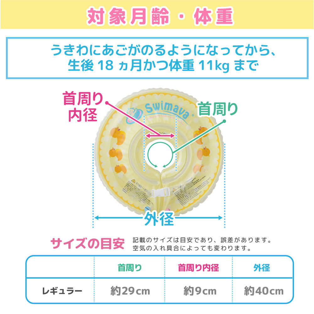 対象:18か月まで、かつ体重11kgまで(浮き輪に顎が乗るようになってからご使用ください)