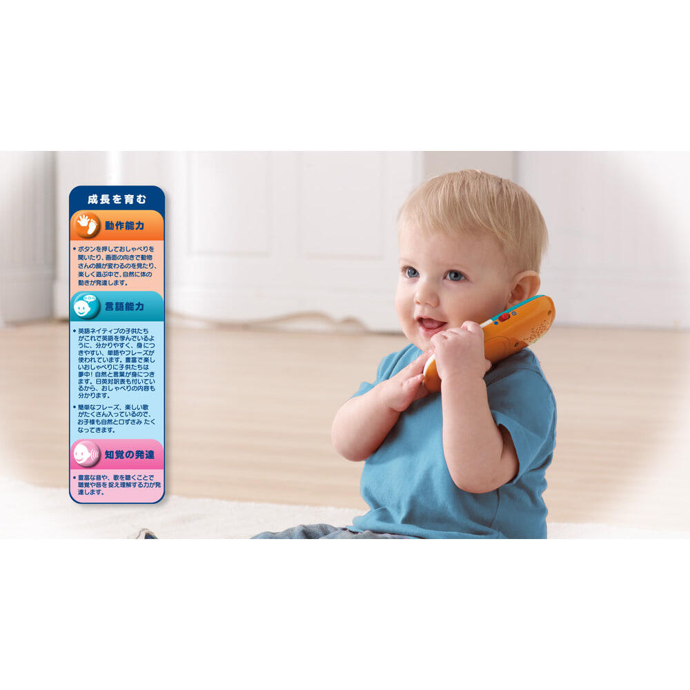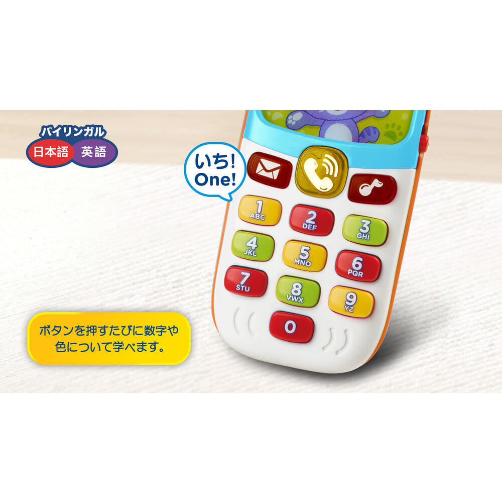 ボタンを押すたびに、日本語と英語で数字や色について学べます。音楽、ボイスメール、電話ボタンで歌を聞いたり、おしゃべりを楽しんだり。