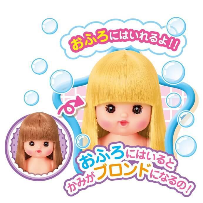 Mell Chan's sister, Nene Chan, has long hair. If she sleeps, she will close her eyes, and they will open when she wakes up. When you bathe with her, her hair will turn blonde. It's a fun set for squeezing, drinking juice, and arranging hair with Nene Chan.includes