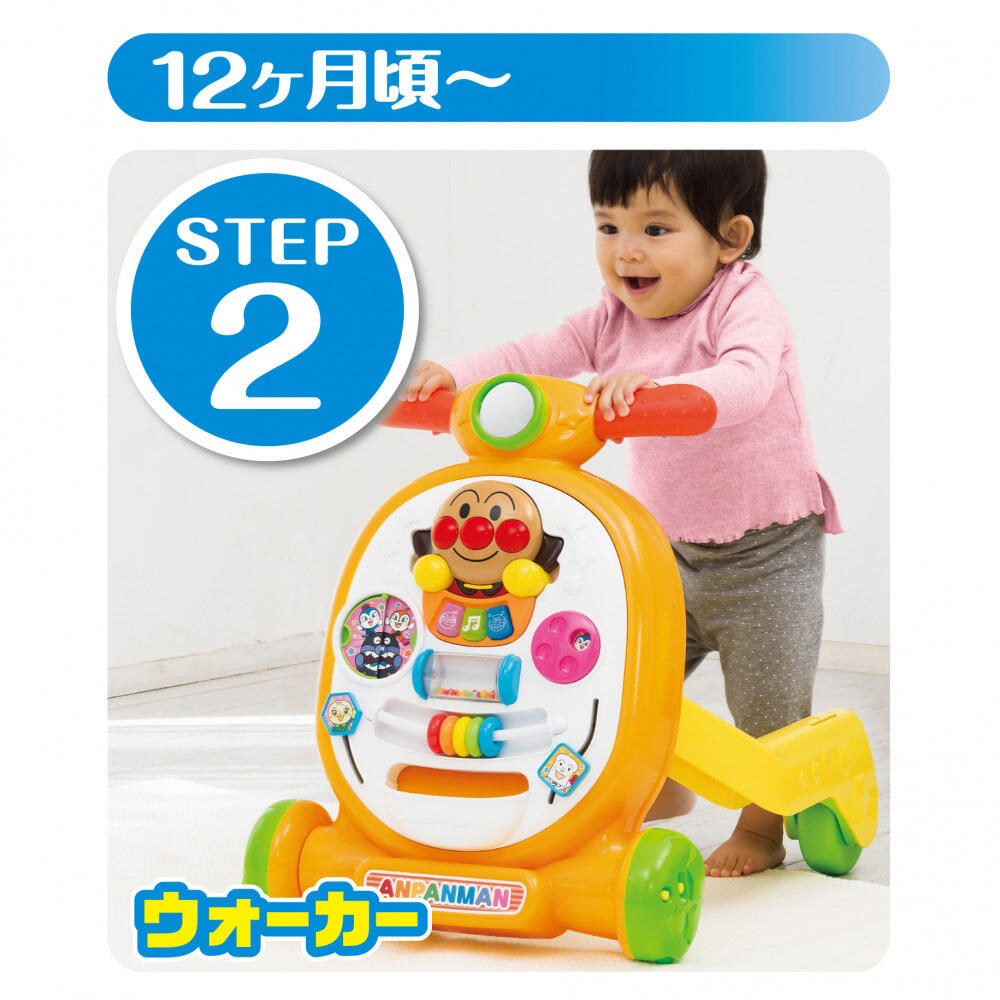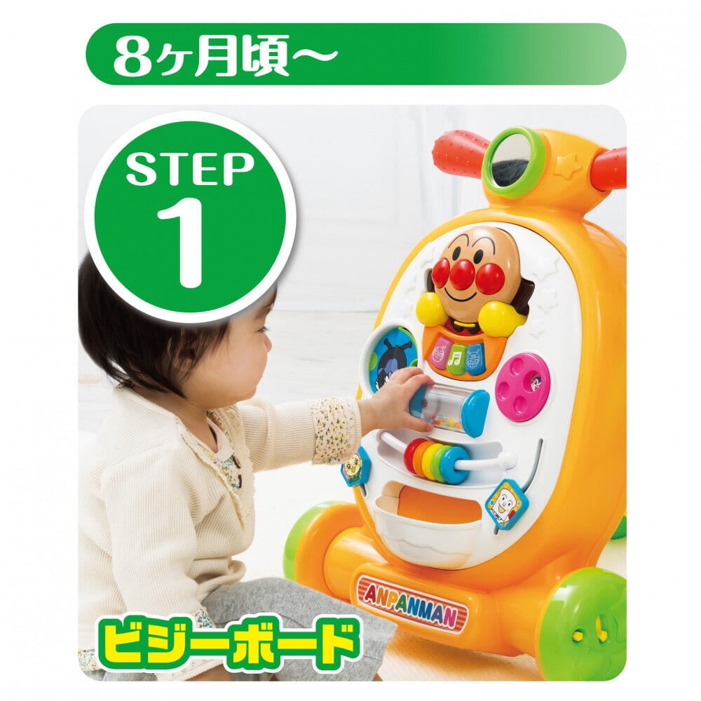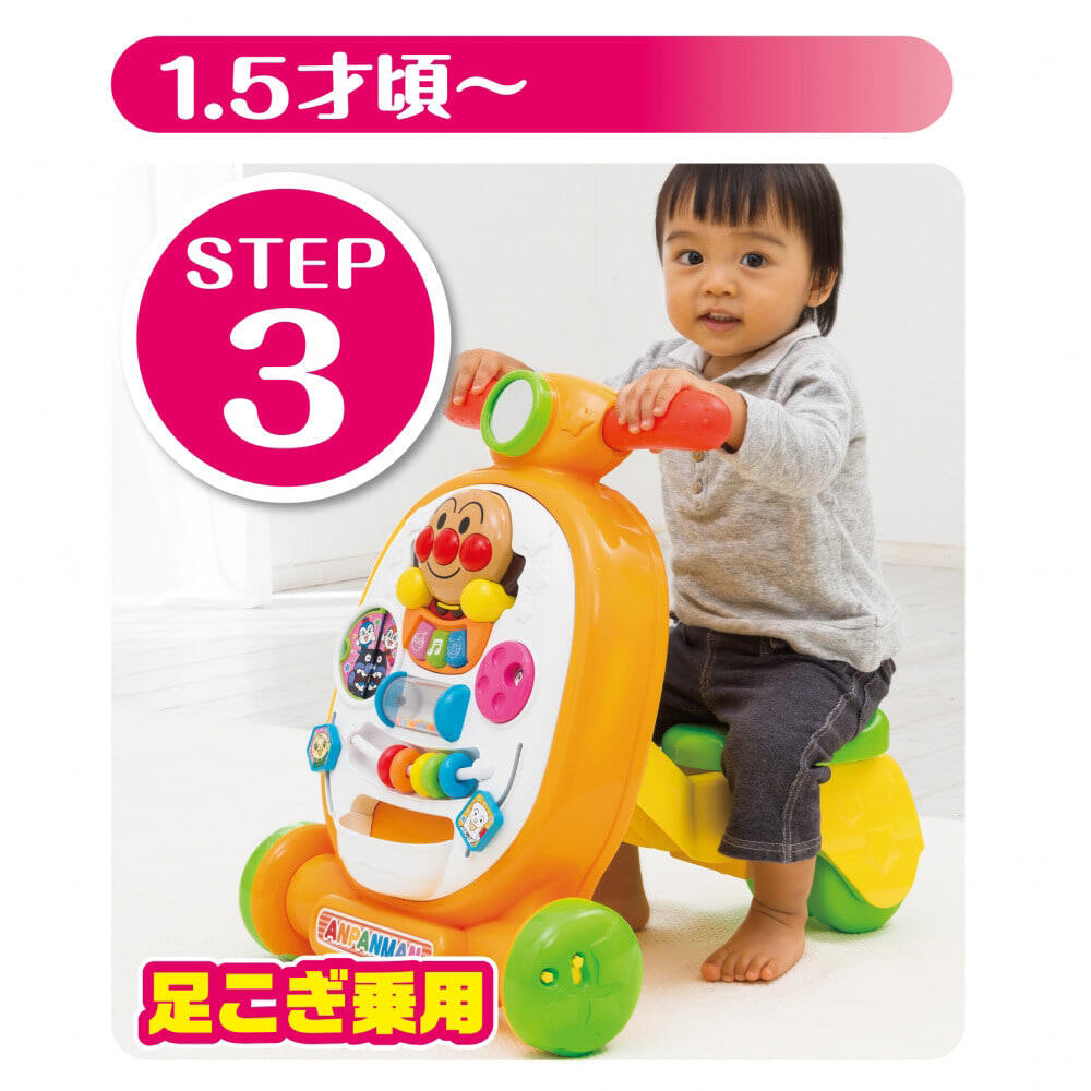 ビジーボード(おすわりの頃から)、ウォーカー(あんよの頃)、乗用(1.5才頃)の3STEPで長く遊べます。