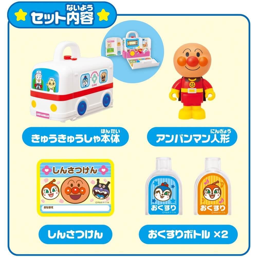 <セット内容>きゅうきゅうしゃ本体、しんさつけん、おくすりボトル×2.アンパンマン人形