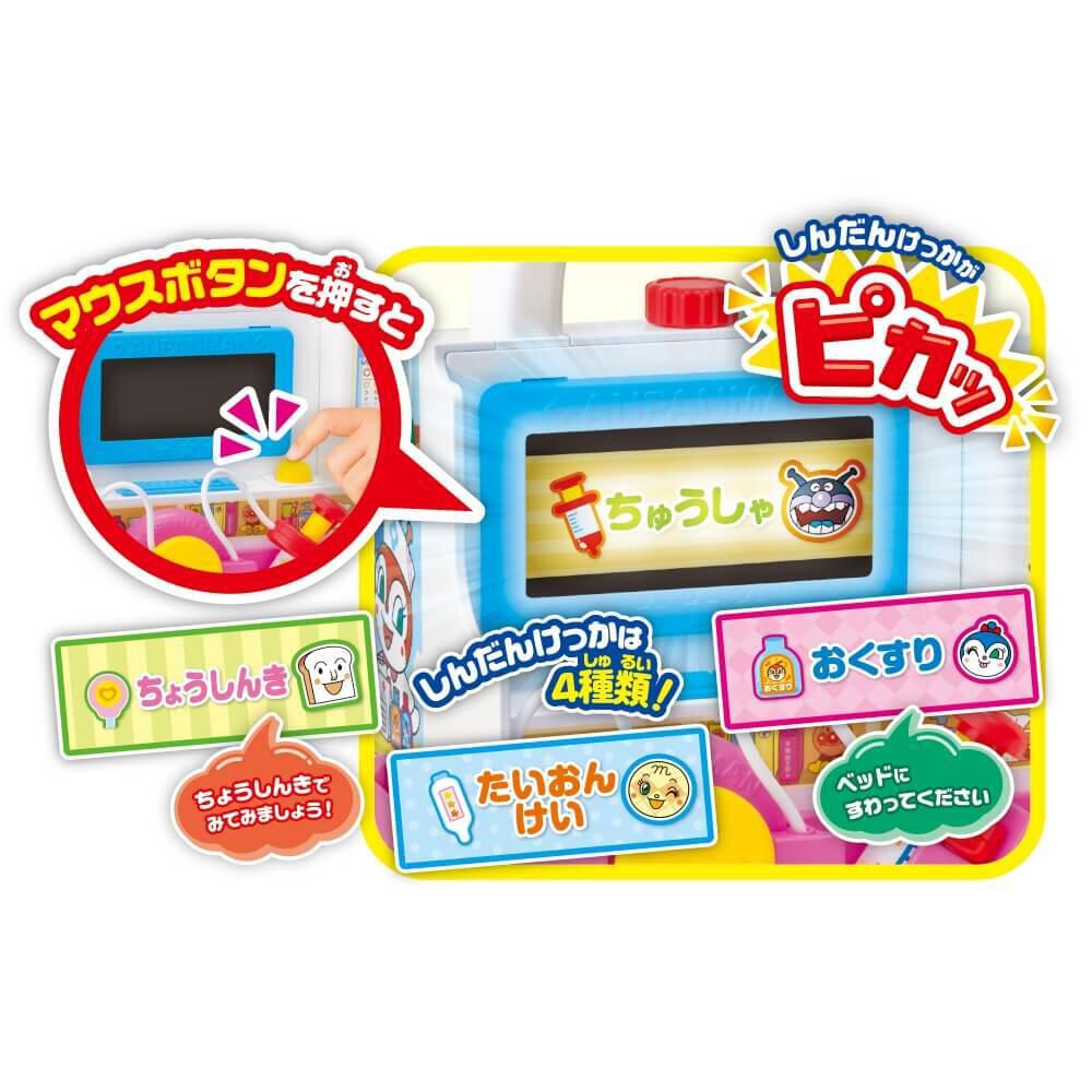 マウスボタンを押すとおしゃべりが流れて、しんだんモニターがピカッ!と光って、アンパンマンやばいきんまん、しょくぱんまんやドキンちゃんが診断結果をおしゃべりで教えてくれるよ!