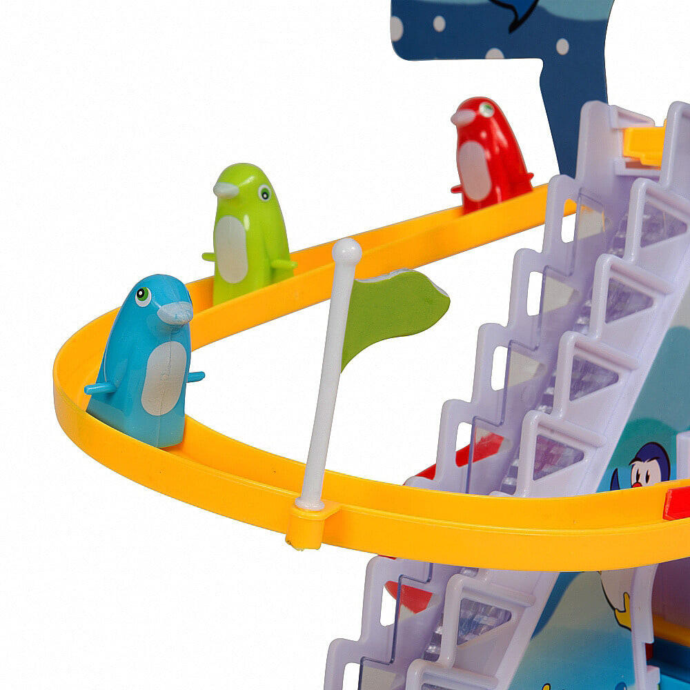 2. 電源をONにすると、階段が動き出します。ペンギンは順番に階段を登り、スライダーを滑ります。