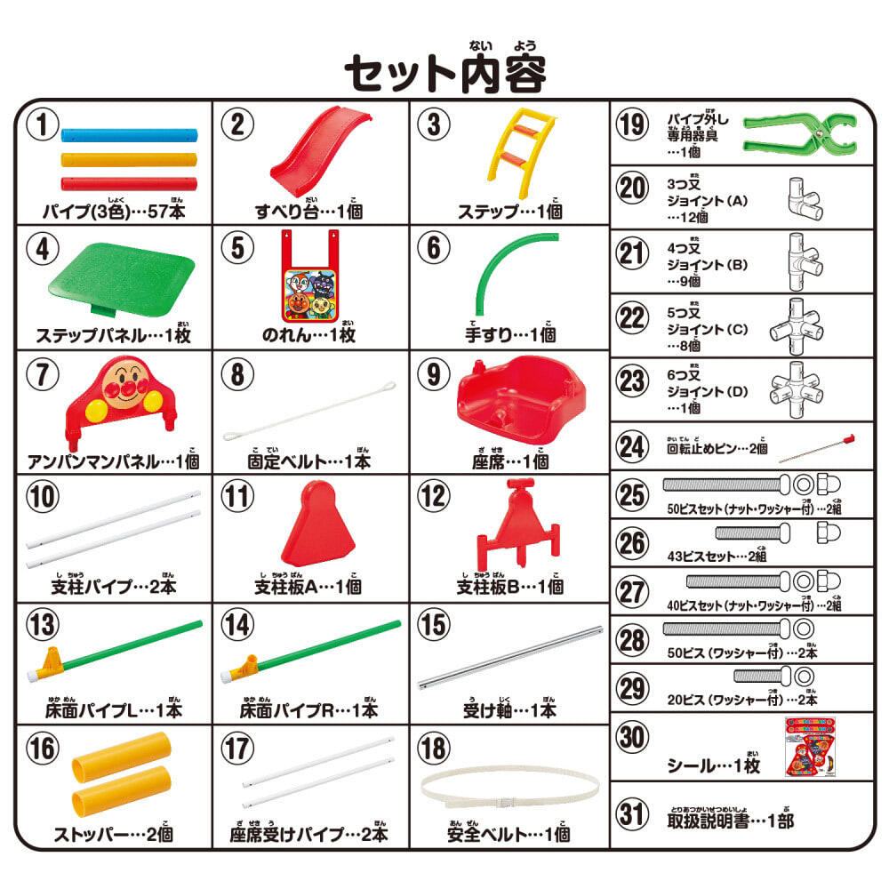 <セット内容>パイプ(3色)×57、すべり台×1、ステップ×1、ステップパネル×1、のれん×1、手すり×1、アンパンマンパネル×1、固定ベルト×1、座席×1、支柱パイプ×2、支柱板A×1、支柱板B×1、床面パイプL×1、床面パイプR×1、受け軸×1、ストッパー×2、座席受けパイプ×2、安全ベルト×1、パイプ外し専用器具×1、3つ又ジョイント(A)×12、4つ又ジョイント(B)×9、5つ又ジョイント(C)×8、6つ又ジョイント(D)×1、回転止めピン×2、シール×1、取扱説明書×1、各種ビスセット