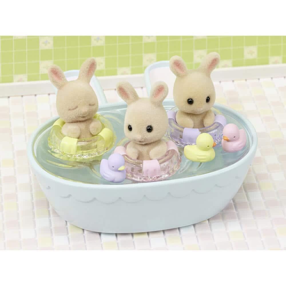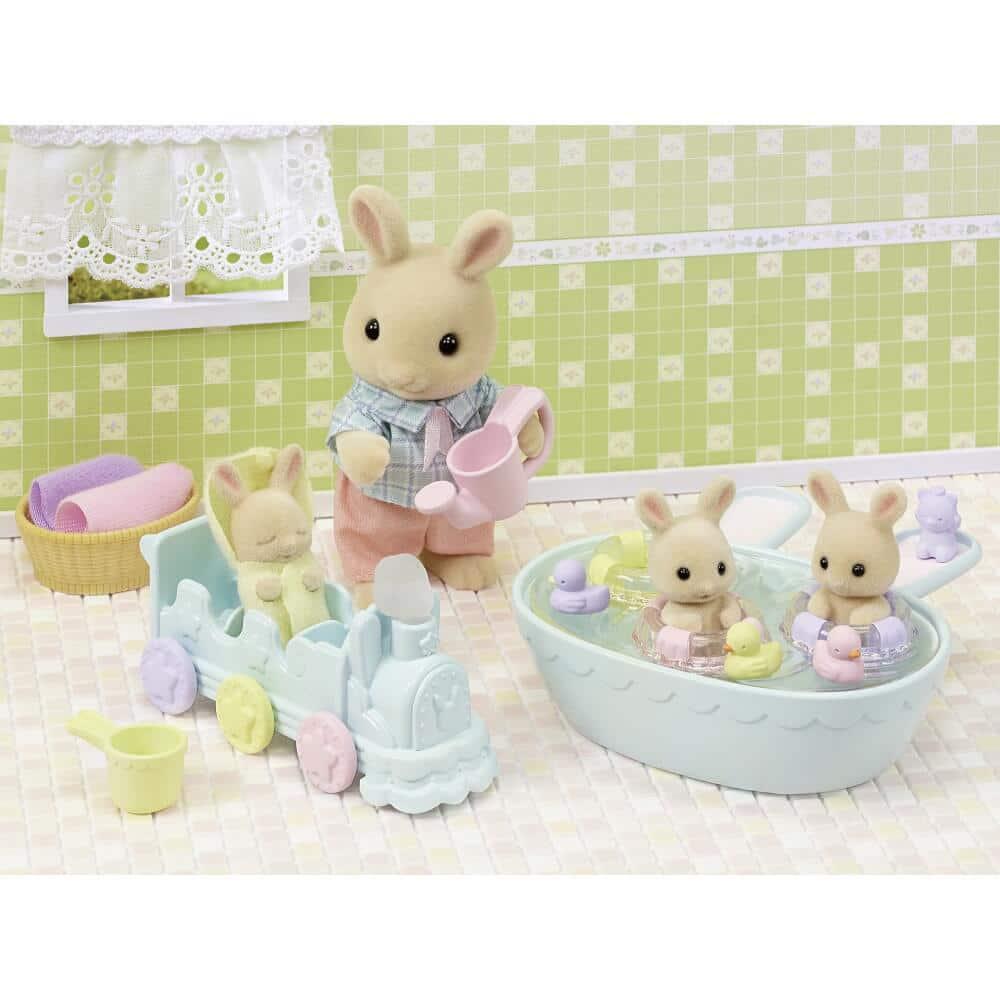 小さくてかわいい、みるくウサギのみつごちゃんの、おふろお世話遊びが楽しめるセットです。