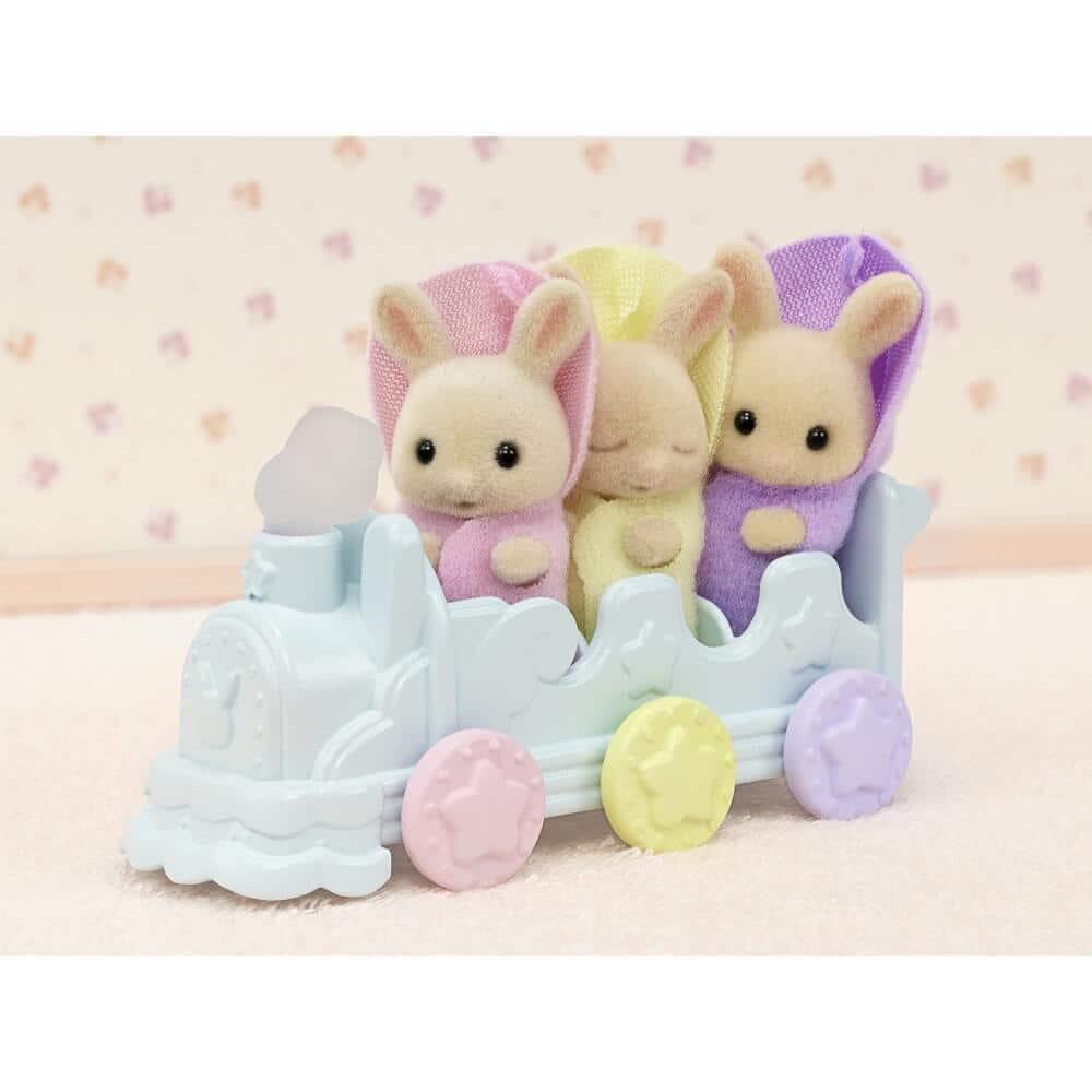 <セット内容>みるくウサギのみつごちゃん (にこにこ ピンク服)、みるくウサギのみつごちゃん(おすまし パープル服)、みるくウサギのみつごちゃん(おねむり イエロー服)、ベビーバス、水面パーツ、汽車の手押しぐるま、シャンプー、手おけ、ジョウロ、アヒルのおもちゃ(ピンク)、アヒルのおもちゃ(イエロー)、アヒルのおもちゃ(パープル)