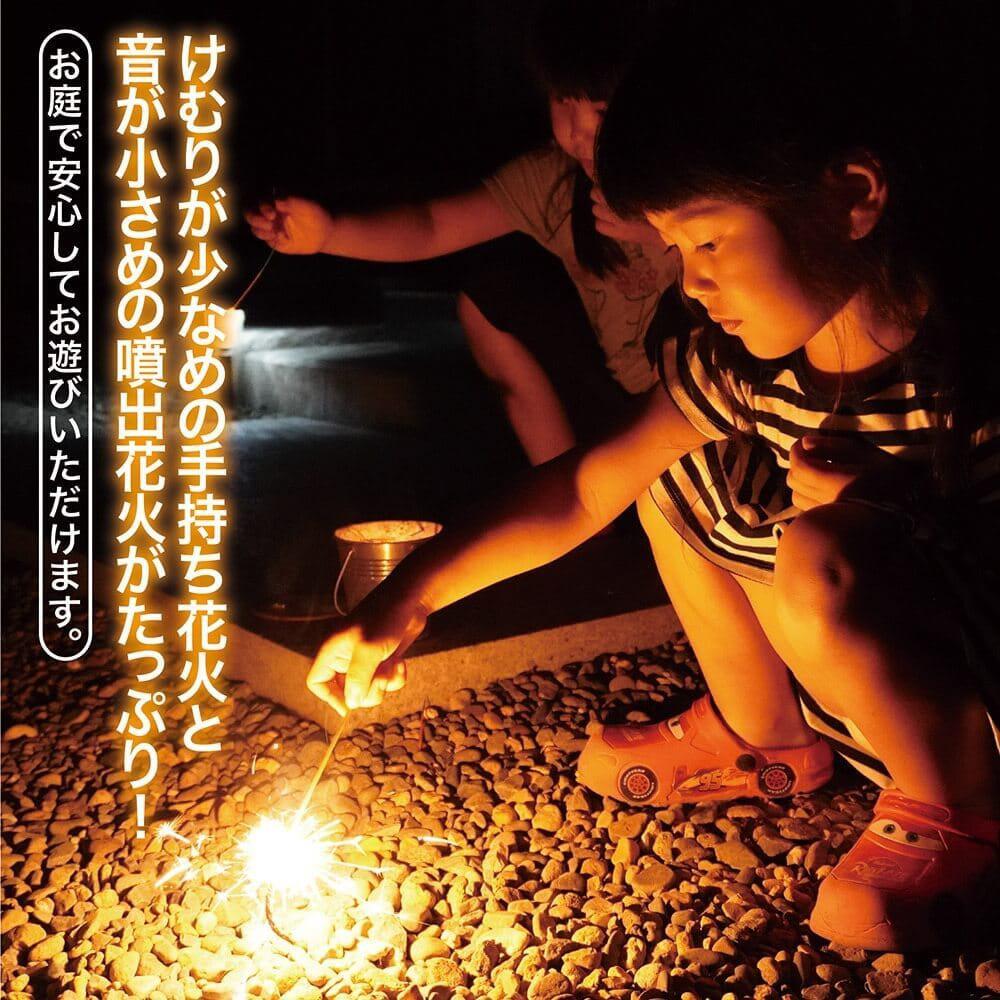 4人でお庭で20分たのしくあそべる、盛りだくさんの花火セット!煙が少なめで音が小さめなのでご近所に配慮したい方にぴったりです!