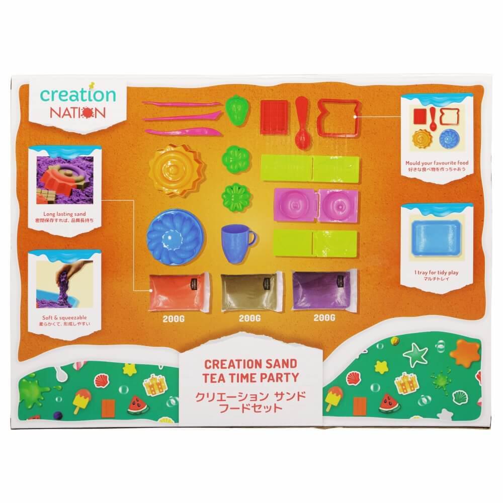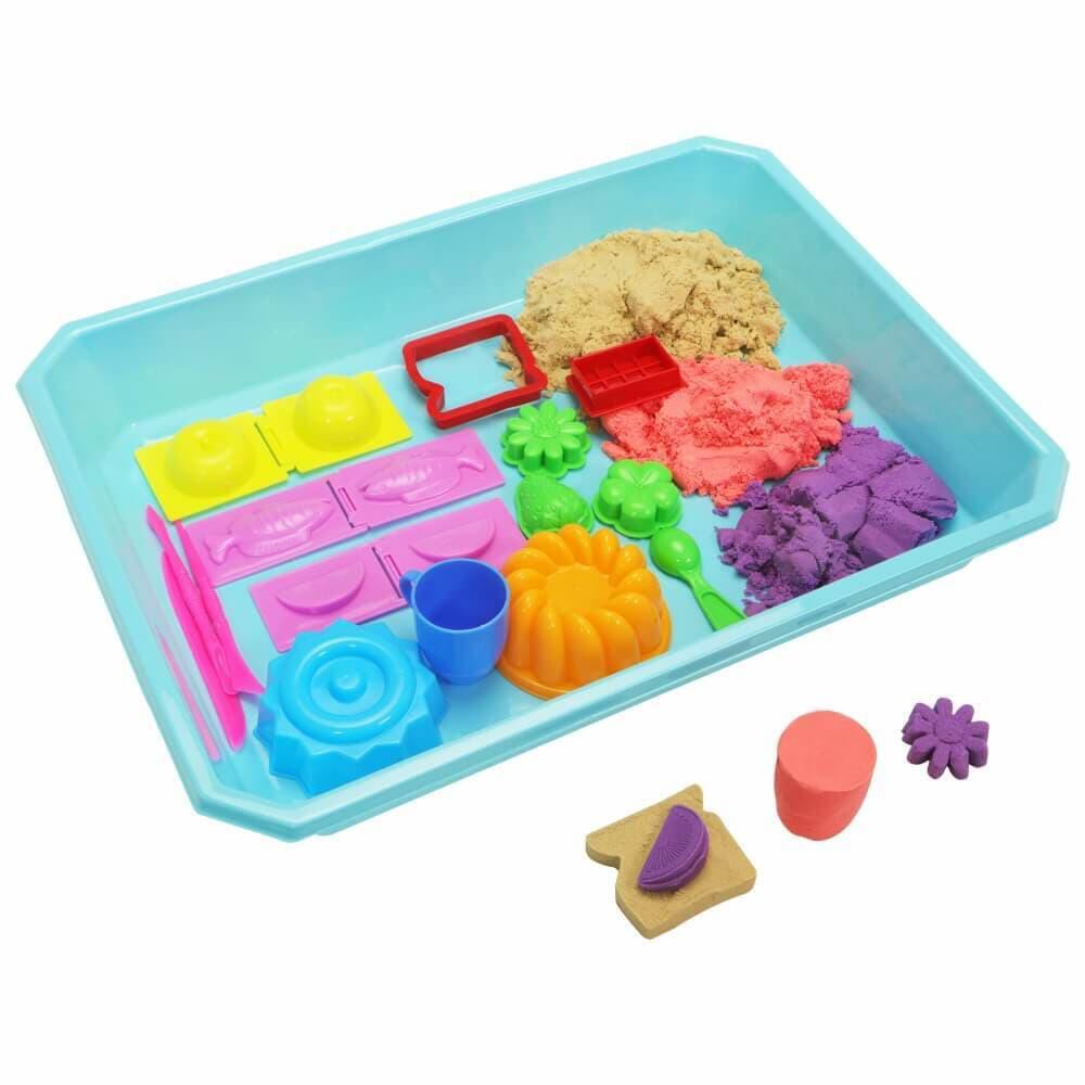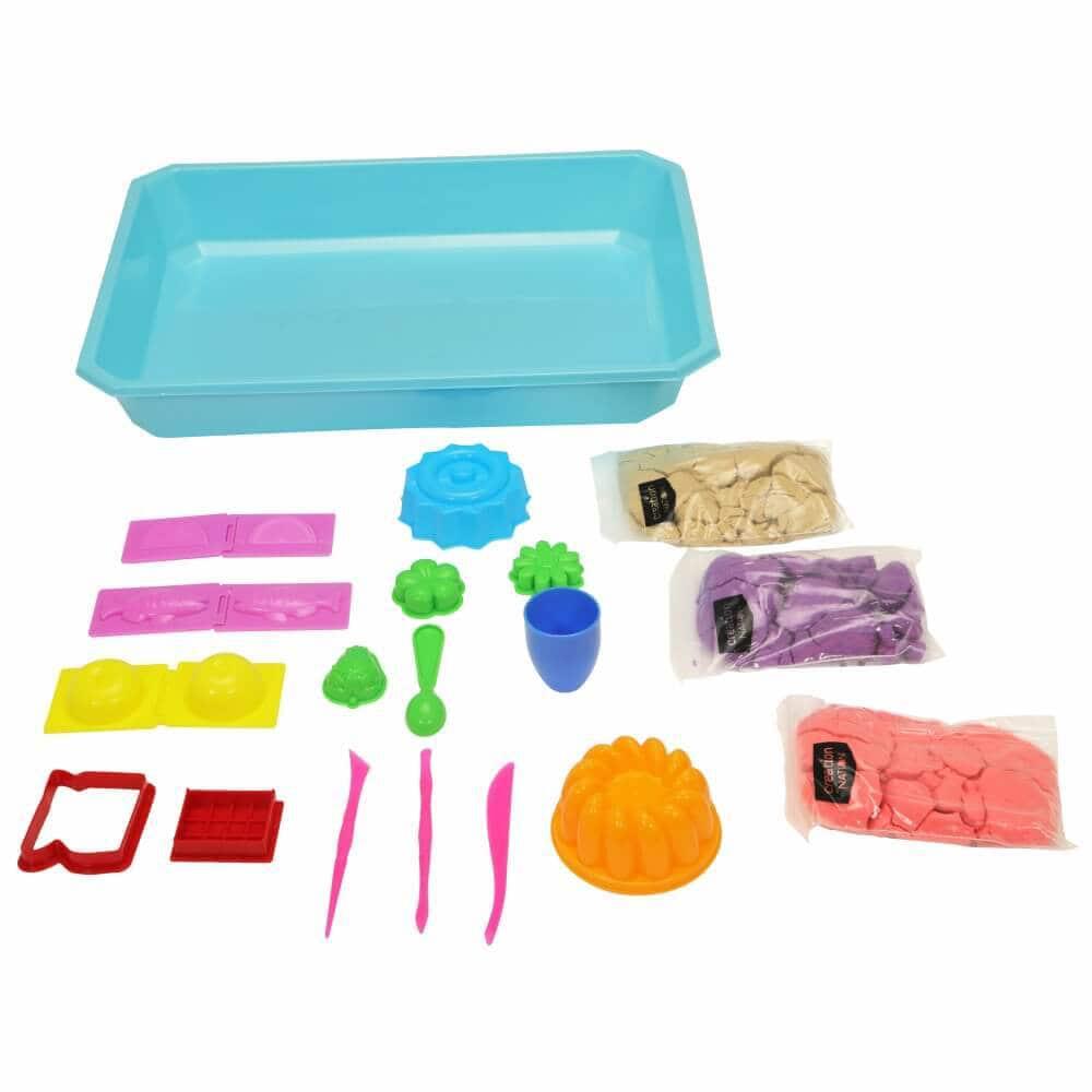 <セット内容>サンド(ブラウン 200g)、サンド(レッド 200g)、サンド(パープル 200g)、マルチトレイ、型x10種、ヘラ×3種、カップ、スプーン