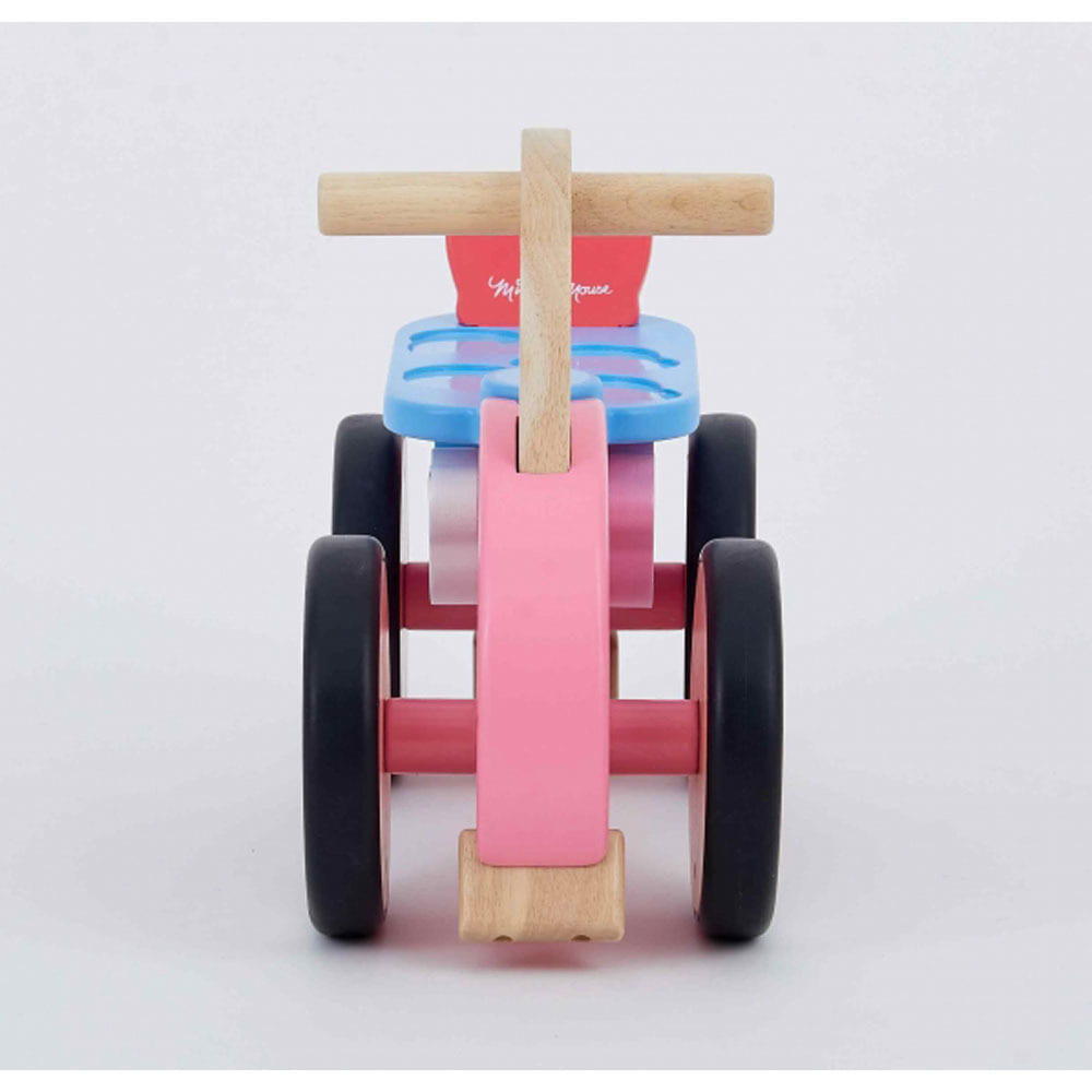 (押す)つかま立ちができるようになったら、まずは押し車。ミニーたちと一緒によちよち歩きのお手伝い。安定感のある木製本体がおぼつかない歩行を手助けします。楽しく歩いてバランス感覚や筋力を身につけよう。