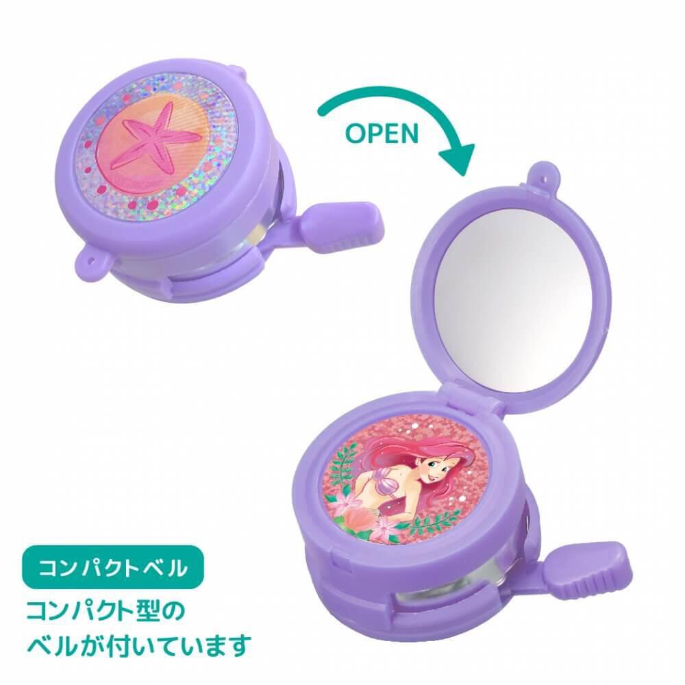ベルは鏡の付いたコンパクト型ベル。ブレーキワイヤーには宝石とパールのアクセサリーが付き、スポークにはカラフルなハート型アクセサリーが付いているので、とってもキュート!