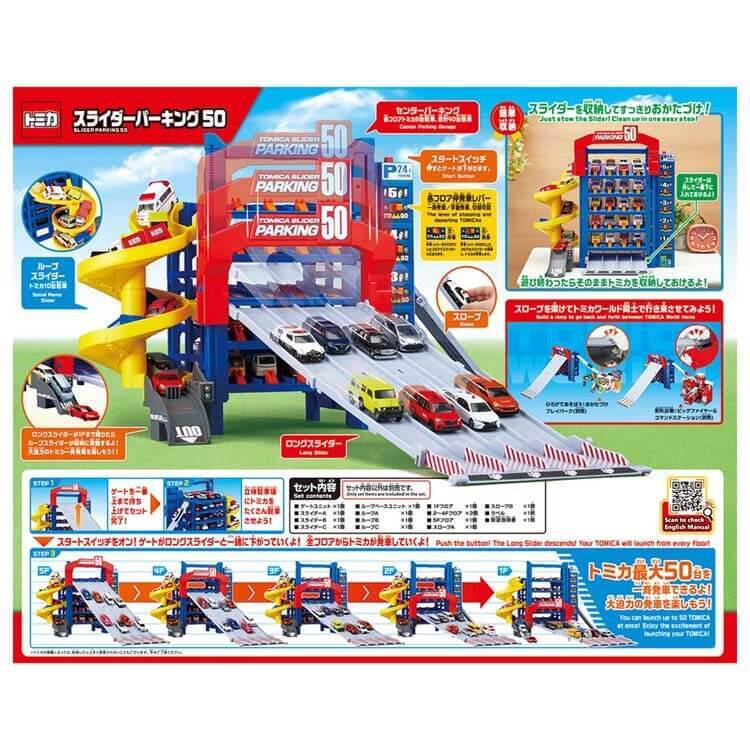 トミカ史上最大の50台で遊べる「スライダーパーキング50」は、2種類のスライダーを備えてさまざまな遊び方ができる5階建て大型駐車場。