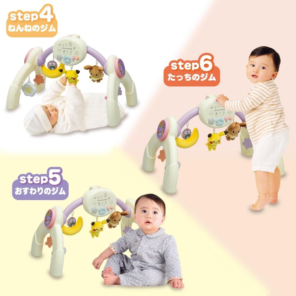 成長に合わせて長く遊べる!7つのステップに簡単へんしん!モンポケ7ステップメリージムが新しく生まれ変わって新発売♪空回り機構、15分タイマー付、静音設計。人形は取り外してぬいぐるみ遊びもできます♪