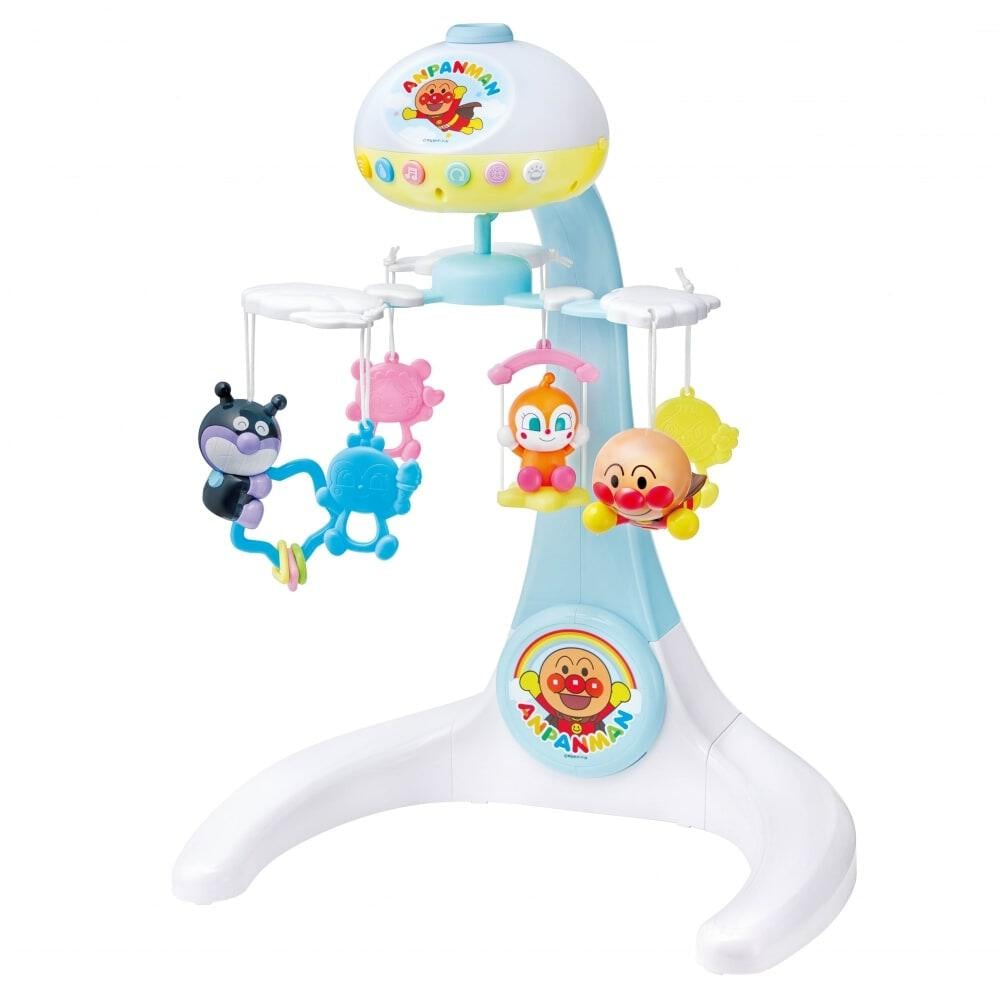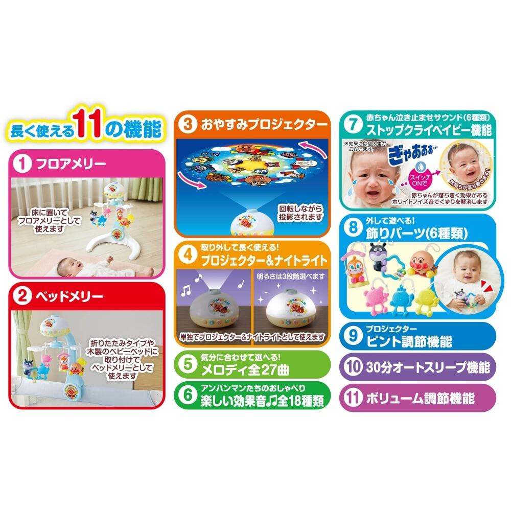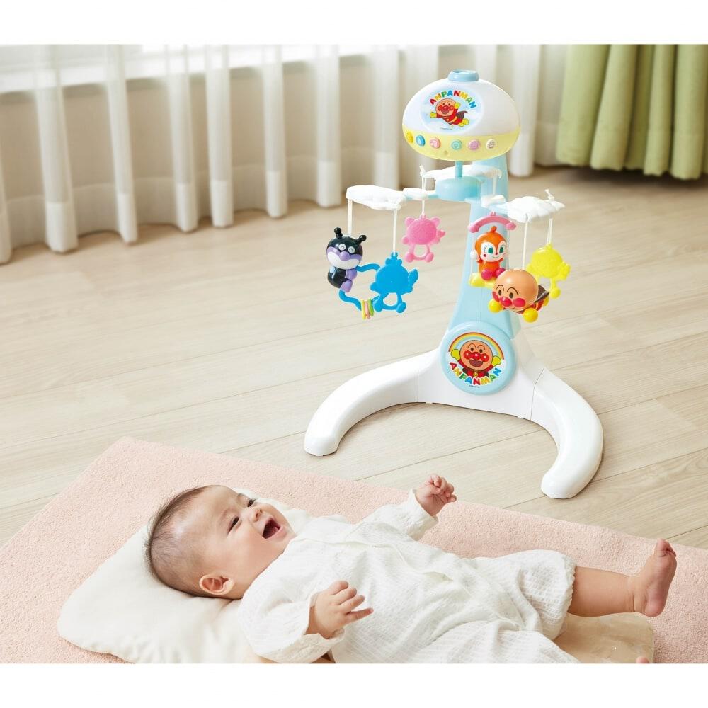 天井にアンパンマンと仲間たちの映像が映し出されるプロジェクション機能が搭載され、昼だけでなく夜間のぐずりや寝かしつけにも活躍するメリー。