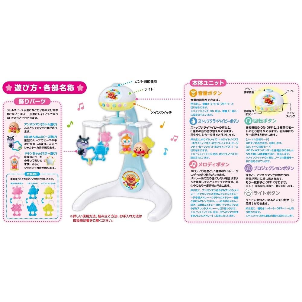 <セット内容>本体ユニット、支柱、土台、脚(左)、脚(右)、回転アーム、飾りパーツ(アンパンマン)、飾りパーツ(ばいきんまん)、飾りパーツ(ドキンちゃん)、飾りパーツ(あかちゃんまん)、飾りパーツ(コキンちゃん)、飾りパーツ(メロンパンナちゃん)、取扱説明書