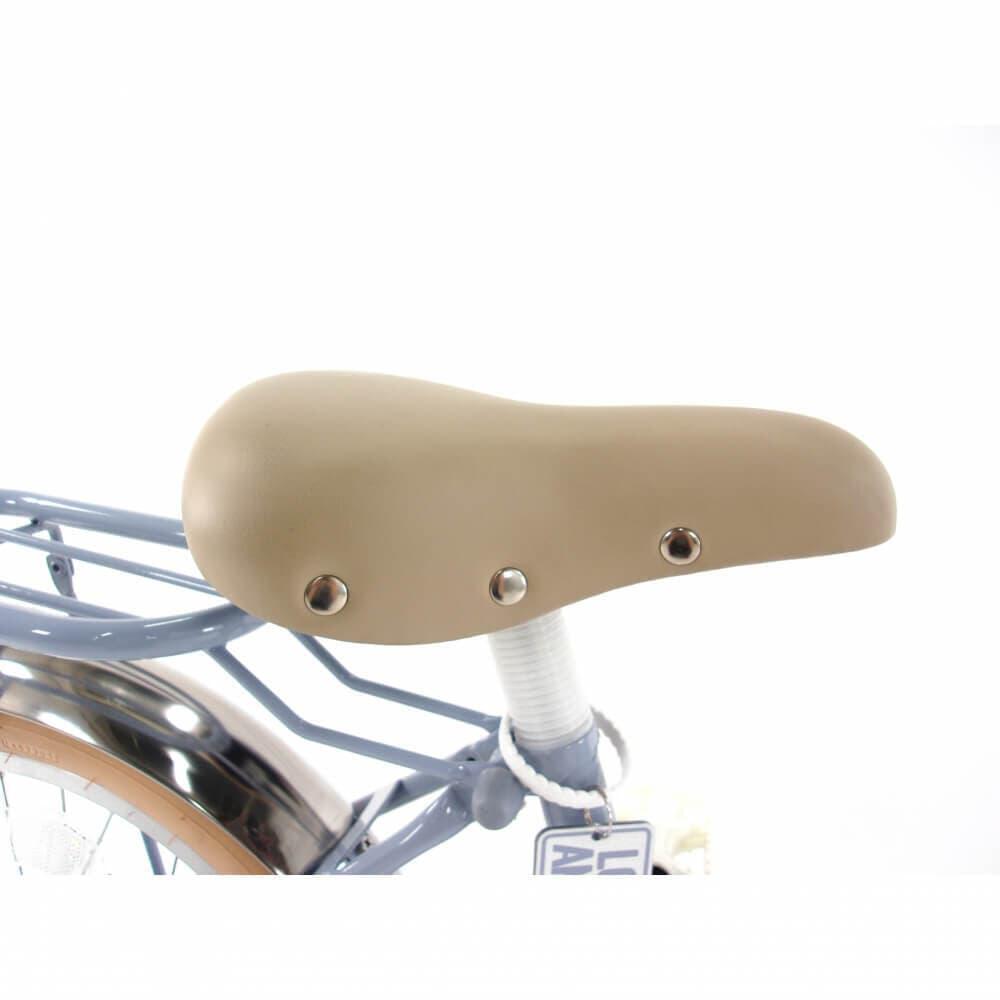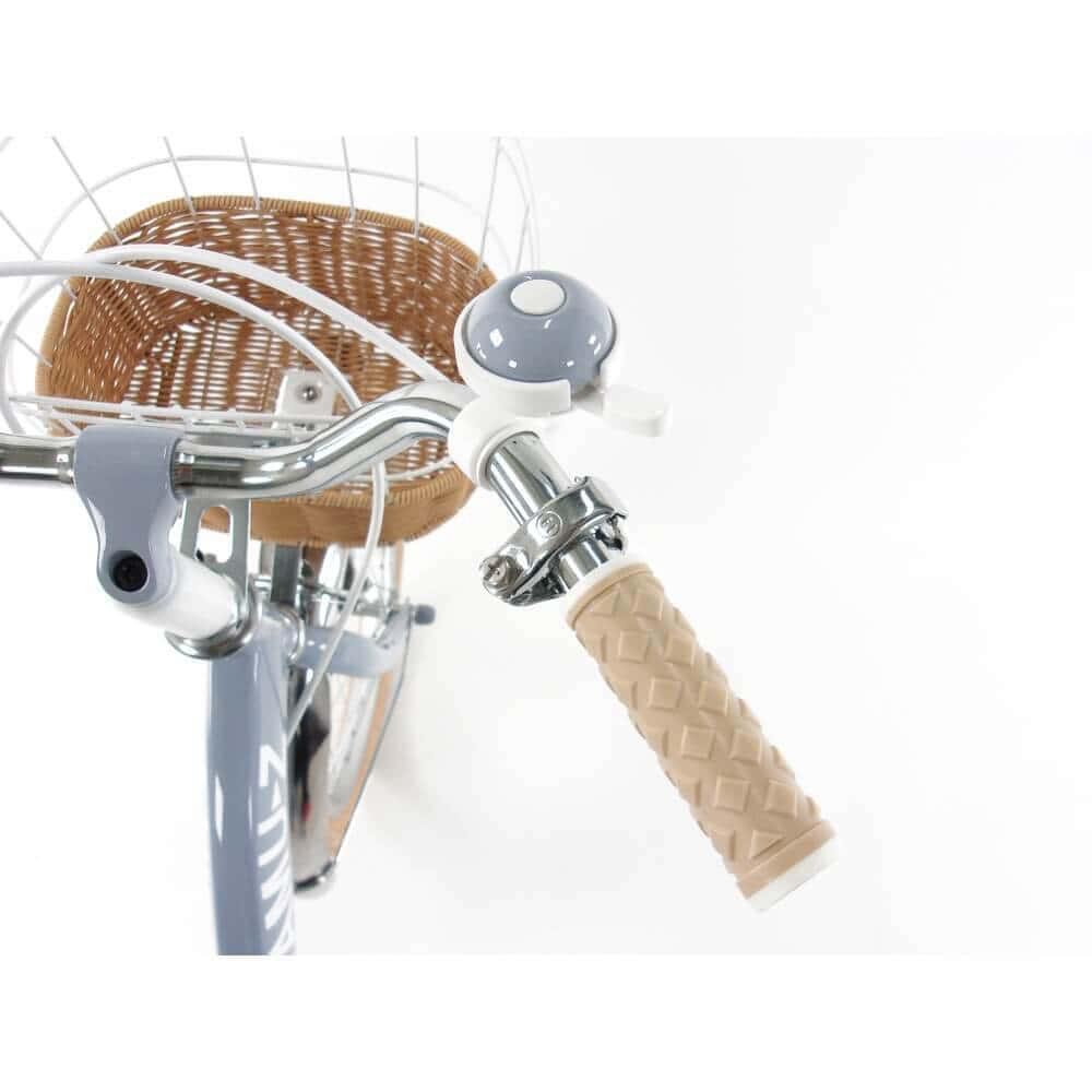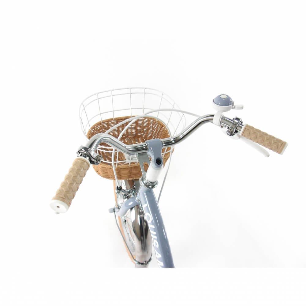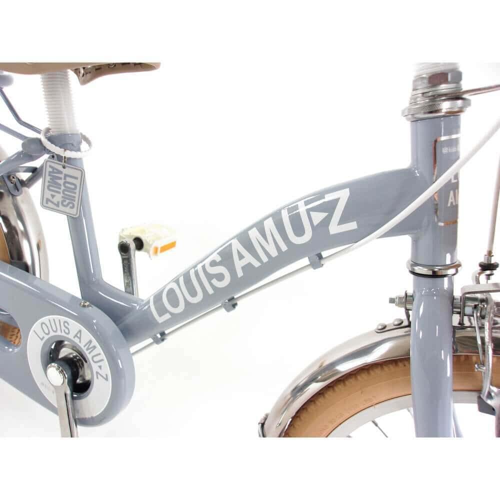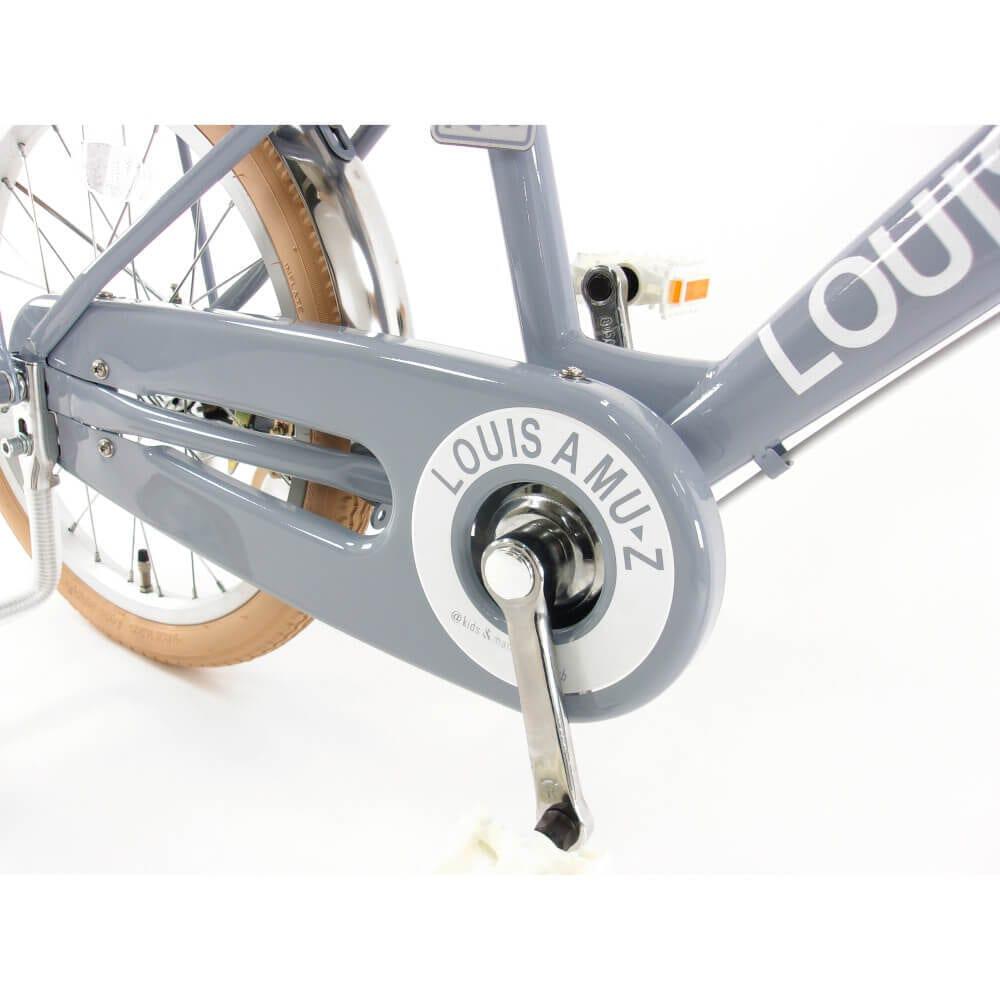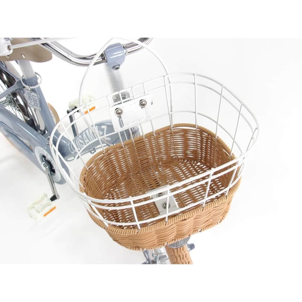 LOUIS AMUZブランド。クラシカルなステンレス泥除けがスタイリッシュなフレームと融合。ベージュタイヤと籐風バスケット&カラーパイプキャリアが可愛い!シンプルなキッズバイク。車のライトによって反射するネームタグ付き。