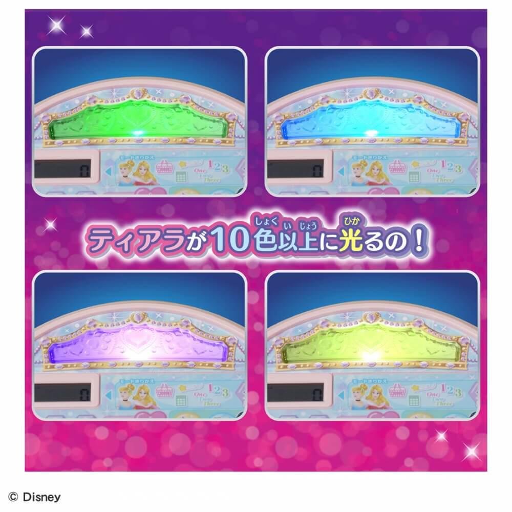 ・プリンセストークボタンで、ディズニープリンセスたちそれぞれのイメージカラーにティアラが輝き、