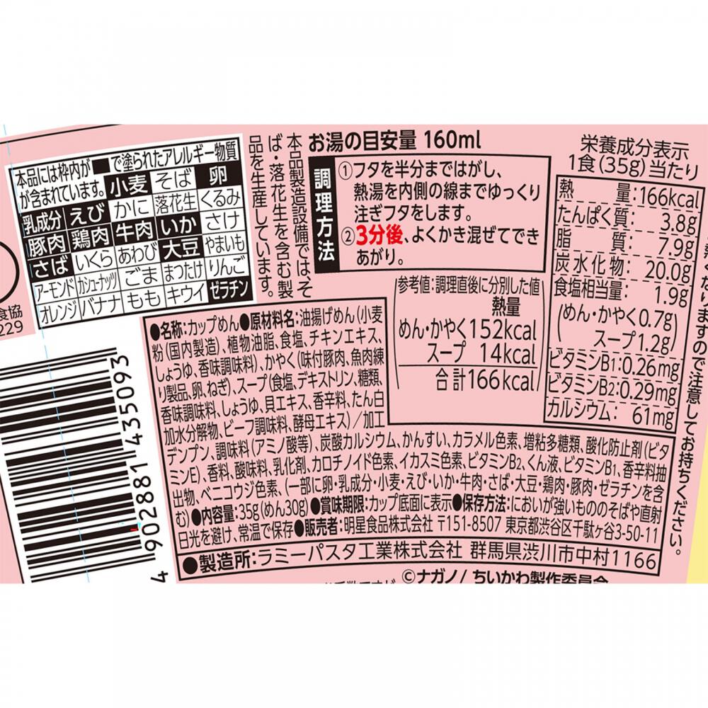 油揚げめん(小麦粉(国内製造)、植物油脂、食塩、チキンエキス、しょうゆ、香味調味料)、かやく(味付豚肉、魚肉練り製品、卵、ねぎ)、スープ(食塩、デキストリン、糖類、香味調味料、しょうゆ、貝エキス、香辛料、たん白加水分解物、ビーフ調味料、酵母エキス)/加工デンプン、調味料(アミノ酸等)、炭酸カルシウム、かんすい、カラメル色素、増粘多糖類、酸化防止剤(ビタミンE)、香料、酸味料、乳化剤、カロチノイド色素、イカスミ色素、ビタミB22、くん液、ビタミンB1、香辛料抽出物、ベニコウジ色素、(一部に卵・乳成分・小麦・えび・いか・牛肉・さば・大豆・鶏肉・豚肉・ゼラチンを含む)