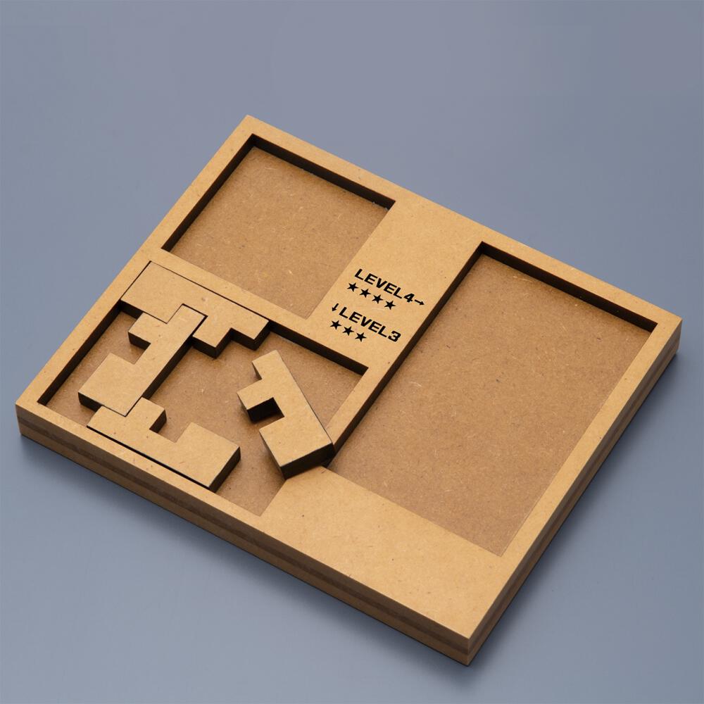 ピースの枠内に同じ形の4ピースを配置し、上下左右に動かなくするパズルです。
