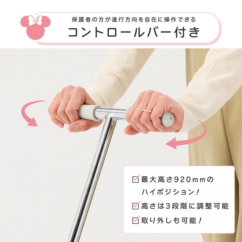 3)保護者の方が進行方向を自在にコントロールできます。使う人に合わせて3段階の高さに調節可能です。(取り外し可能)