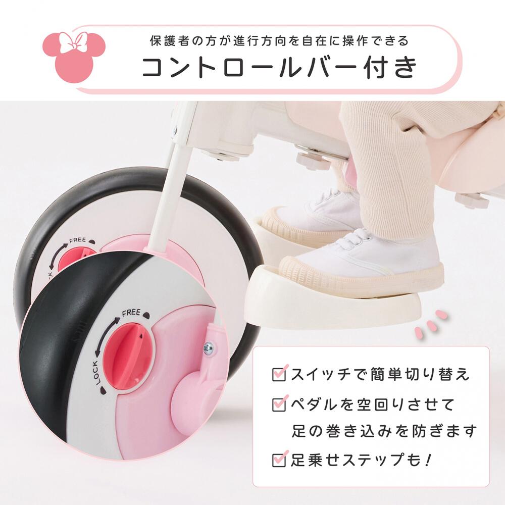4)ロック&フリー機能は、お散歩バー使用時にペダルを空回りさせ、お子様の足の巻き込みを防ぎます。前輪にあるスイッチで、簡単に切り替えることが出来ます。