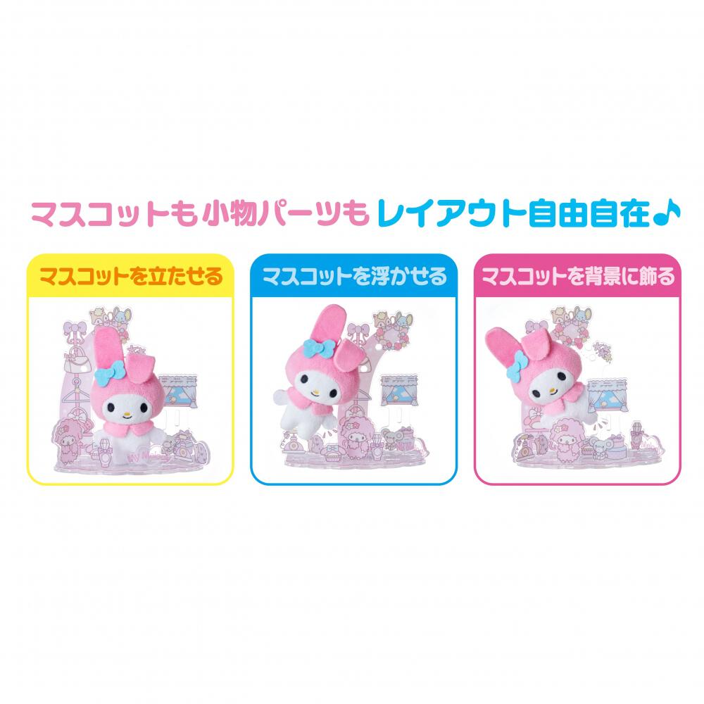 <セット内容>マスコット 1個、自立パーツ 1個、背景パーツ 1個、さし穴付パーツ 1個、土台 1個、小物パーツ 4~5個