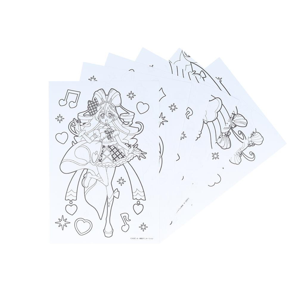自立するハンドバッグ型のケースにぬりえシート6枚、クレヨン5本がセットされたアイテムです。お気に入りの文房具や小物をたっぷり収納でき、おでかけにもお使いいただけます。途中でバッグの口が開かないよう、ストッパーで固定できるのも嬉しいポイントです。キミとアイドルプリキュア柄。