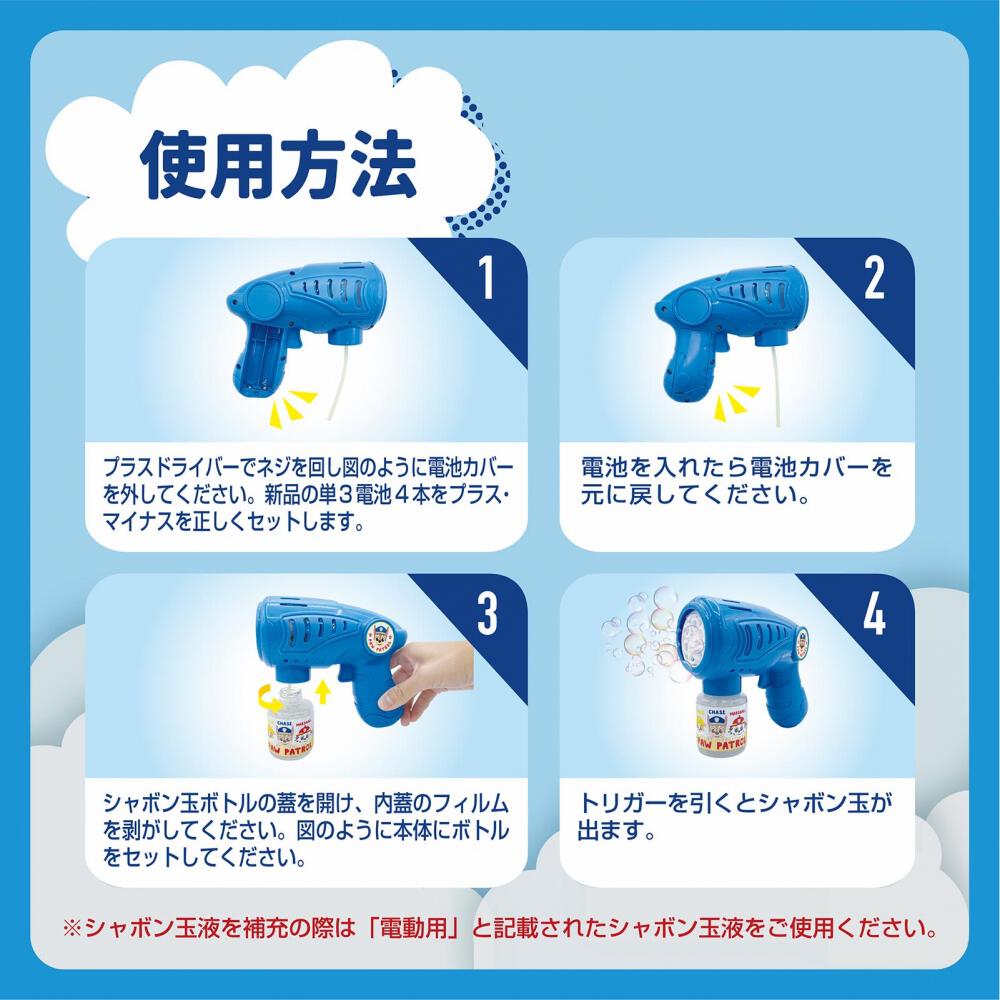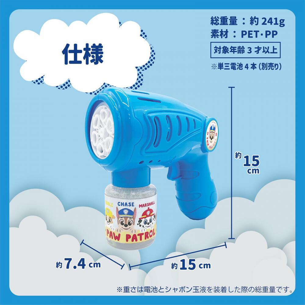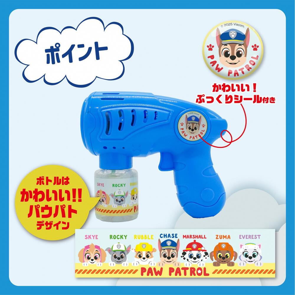 シャボン玉液ボトルとシューターはかわいいパウ・パトロールのデザインになっています。