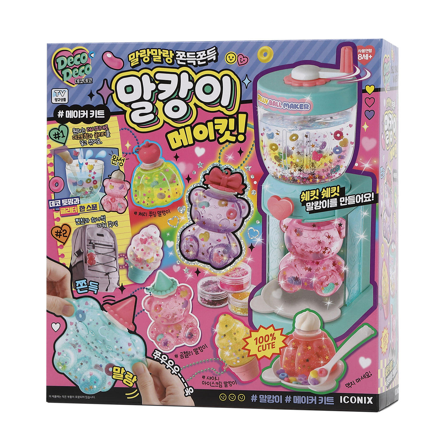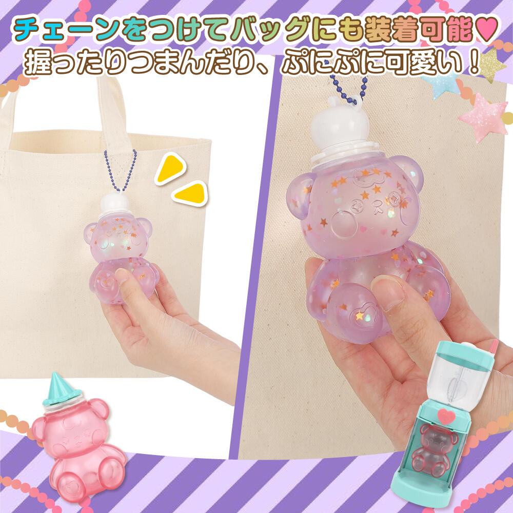 本体、クマ型x3、ゼリー型x2、アイスクリーム型x2、皿、スプーン、レシピ、グリッターX5、収納ボックス、ステッカー、デコトッピング、ボールチェーンx3