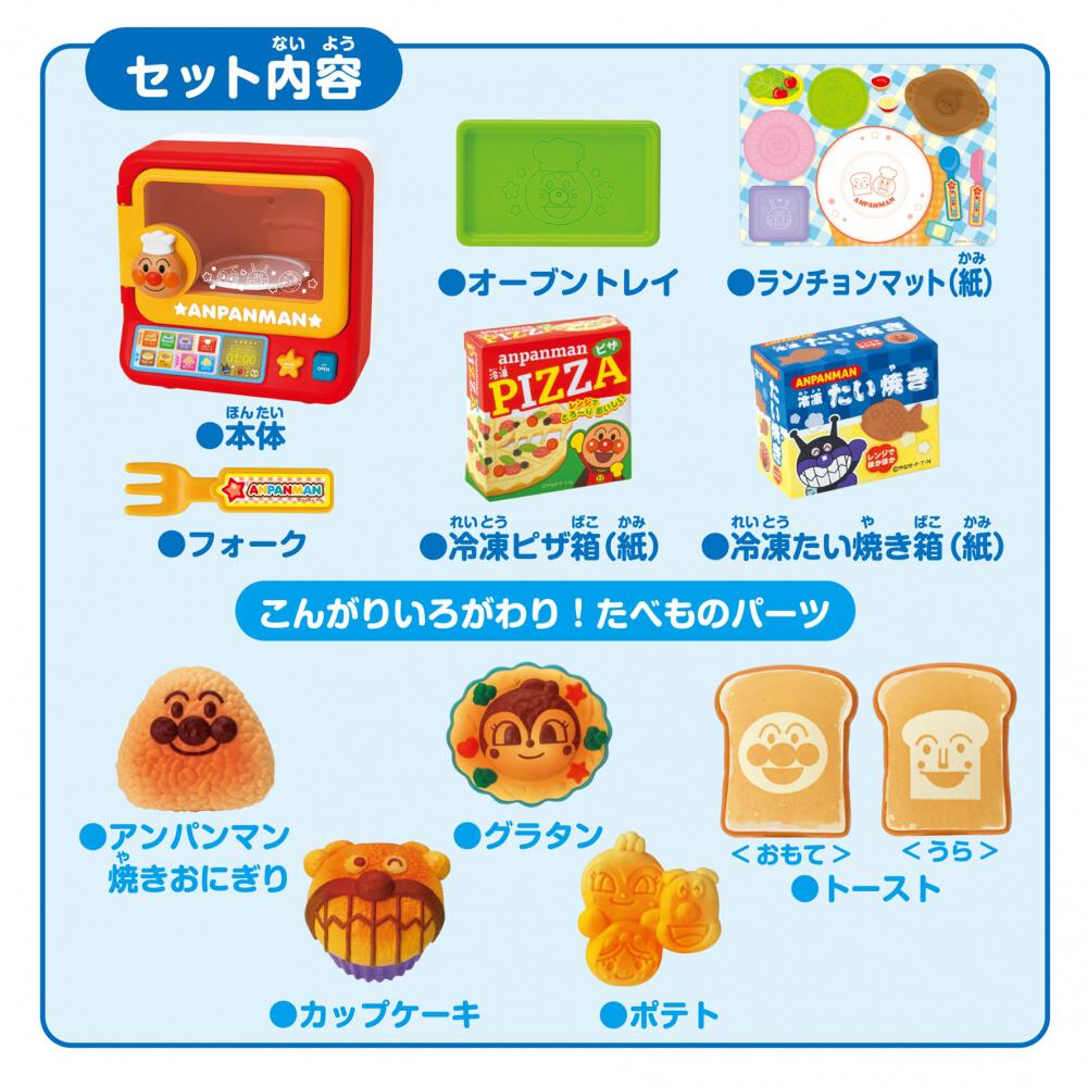 セット内容:本体、オーブントレイ、フォーク、アンパンマン焼きおにぎり、グラタン、カップケーキ、ポテト、トースト、ランチョンマット・冷凍ピザ箱・冷凍たい焼き箱(紙)