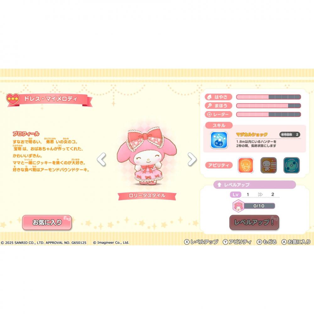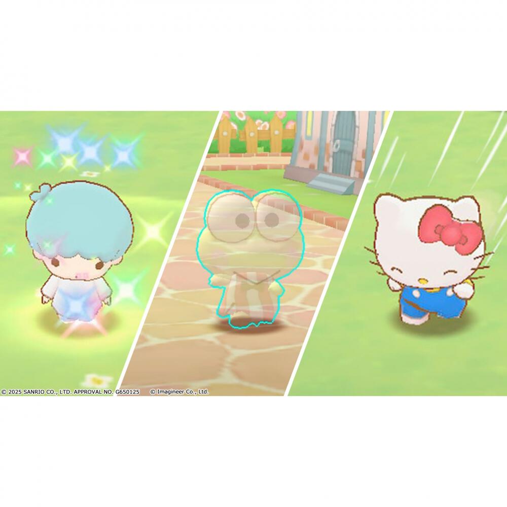 本作は、サンリオの人気キャラクターたちが魔法の世界でおにごっこをするチームアクションゲームです。チャレンジャー(にげる)かハンター(つかまえる)のどちらかを選択し、制限時間内ににげきるか、つかまえられるかを競います。チャレンジャーは6体、ハンターは2体で対戦します。キャラクターごとに持っている「魔法スキル」をうまく使いこなして、無敵になったり透明になったり、ミラクルなおにごっこをお楽しみください。