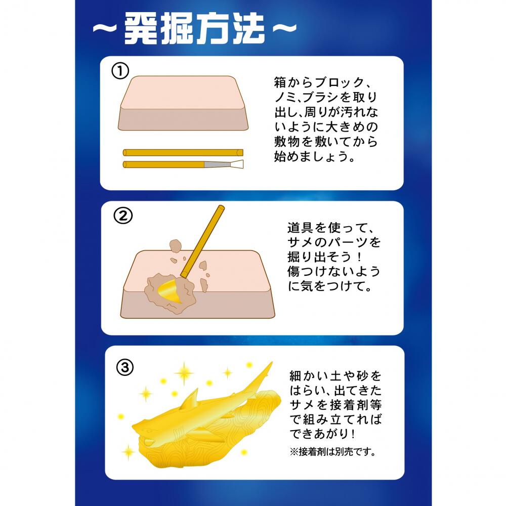 掘って組み立てる楽しい発掘キット!発掘名人シリーズです。サメは全4種類ジンベエザメ・ホオジロザメ・シュモクザメ・ノコギリザメシークレットはサメと本物のサメの歯が!!!
