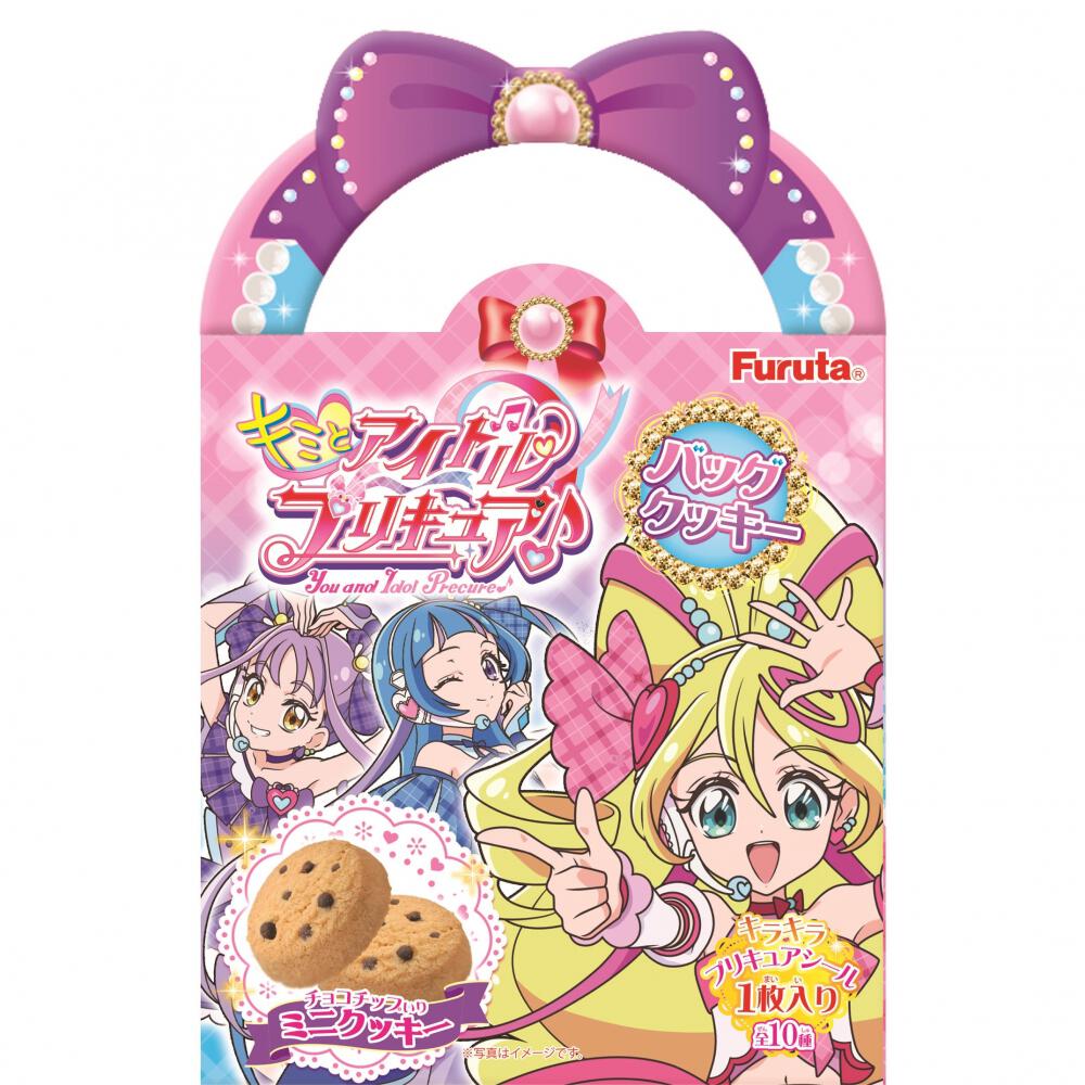 「キミとアイドルプリキュア♪」を起用したバッグ型パッケージが特徴のチョコチップクッキーです。おまけシール1枚入りです(おまけシールは全10種類)
