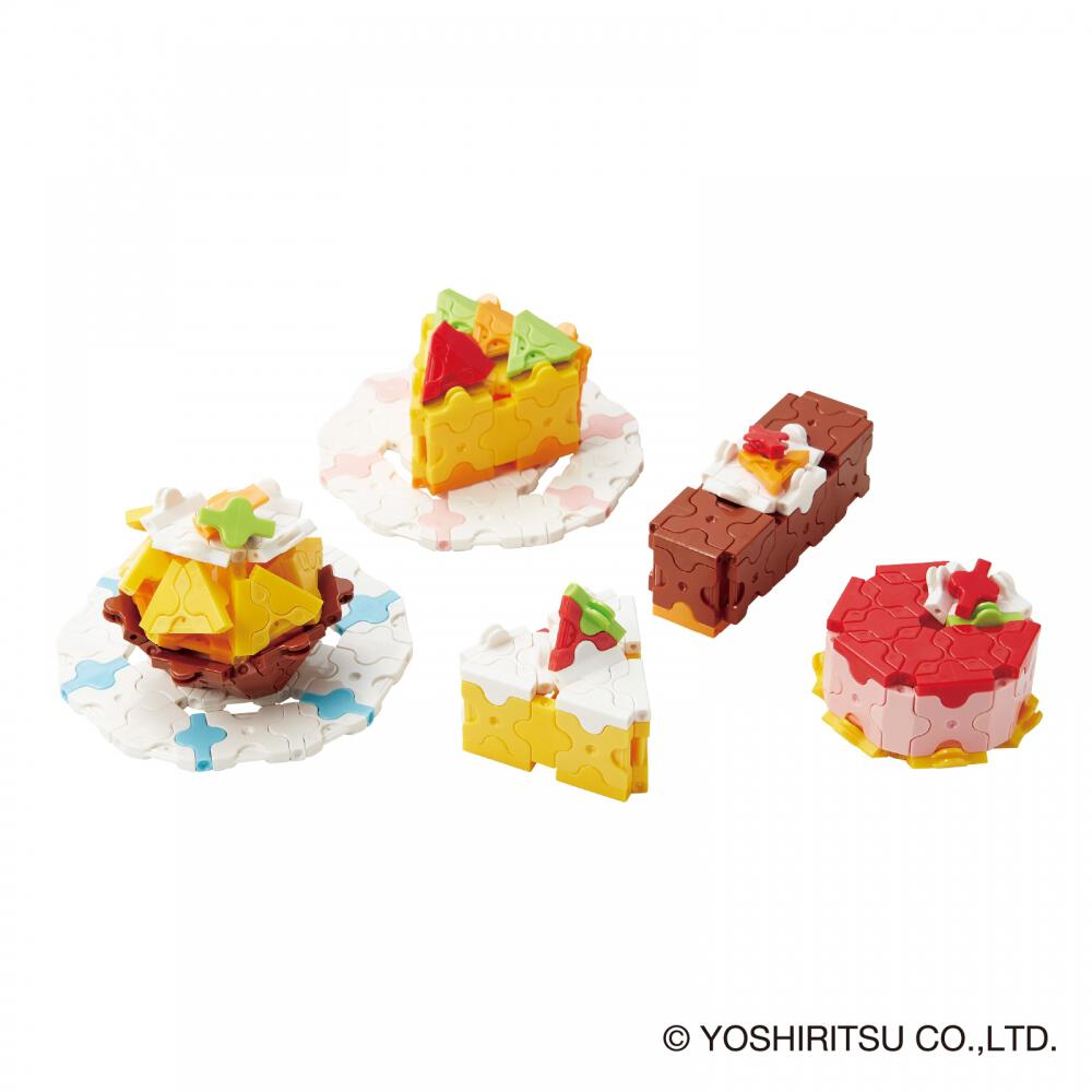 「プチフール」「ポップコーン」「プリン・ア・ラ・モード」「ストロベリーショートケーキ」「フルーツタルト」「クレープ」「ミルフィーユ」「ロールケーキ」「キャンディ」「ミニクロワッサン」「ティーカップ」「ティーパーティ」の計15種類に組み替えられる説明書付き。簡単でかわいい平面作品もつくれます!