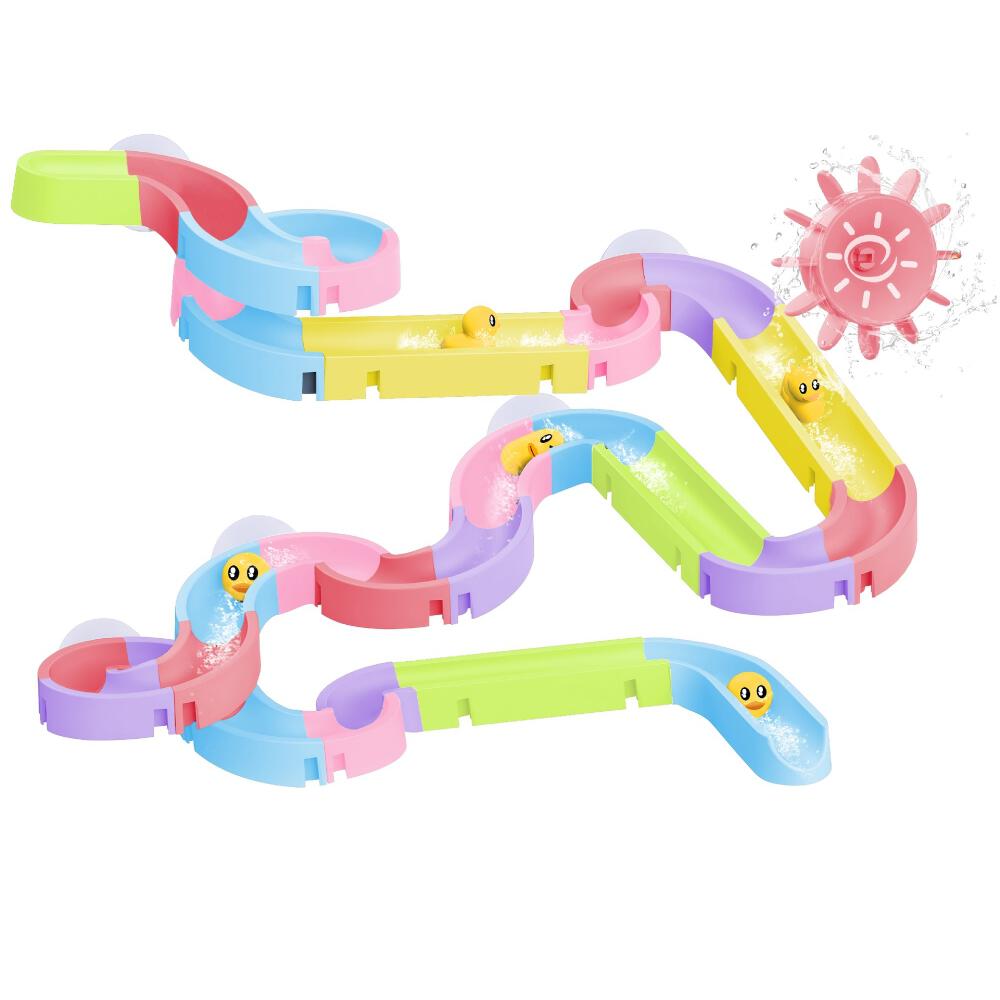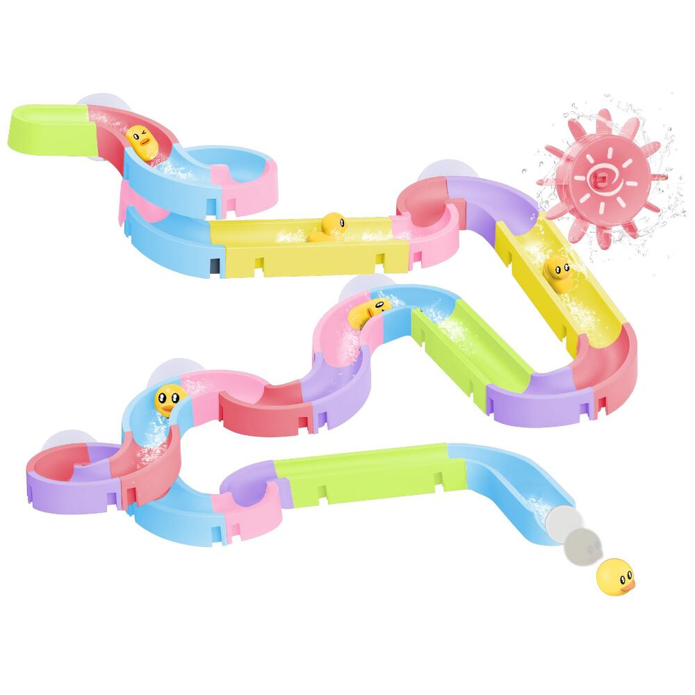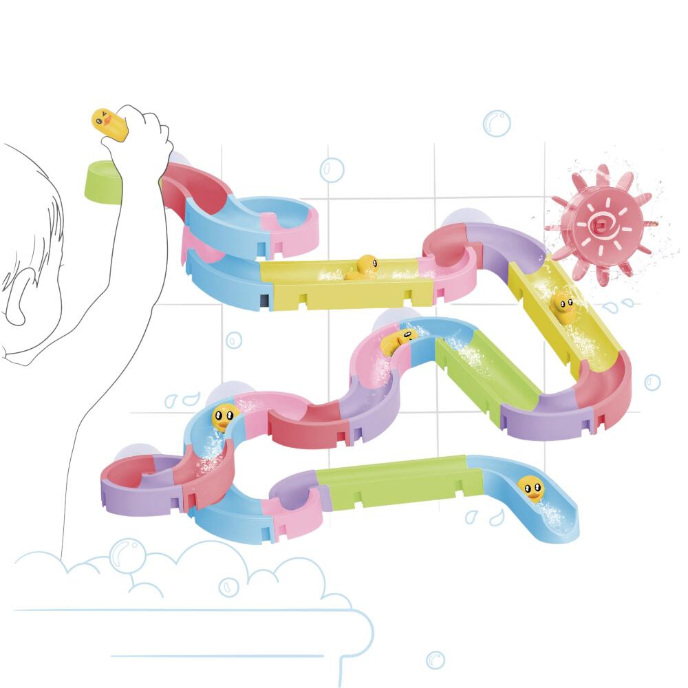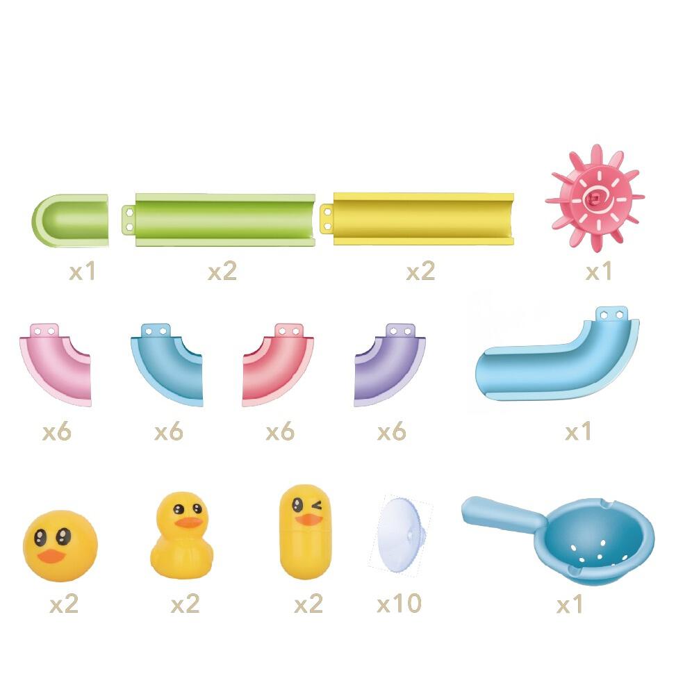 セット内容:アヒルボール3種×各2、吸盤×10、水車パーツ×1、スコップ×1、レール各種