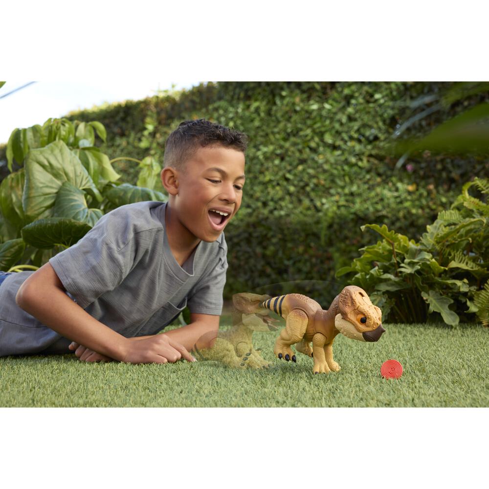 映画 ジュラシック・ワールド リバースに登場するかわいい仲間のアクイロプスのフィギュア。頭をなでて、リコリスをあげててなづけよう!吠えながらジャンプしてアタック!お座りするポーズなどかわいいギミックが満載。