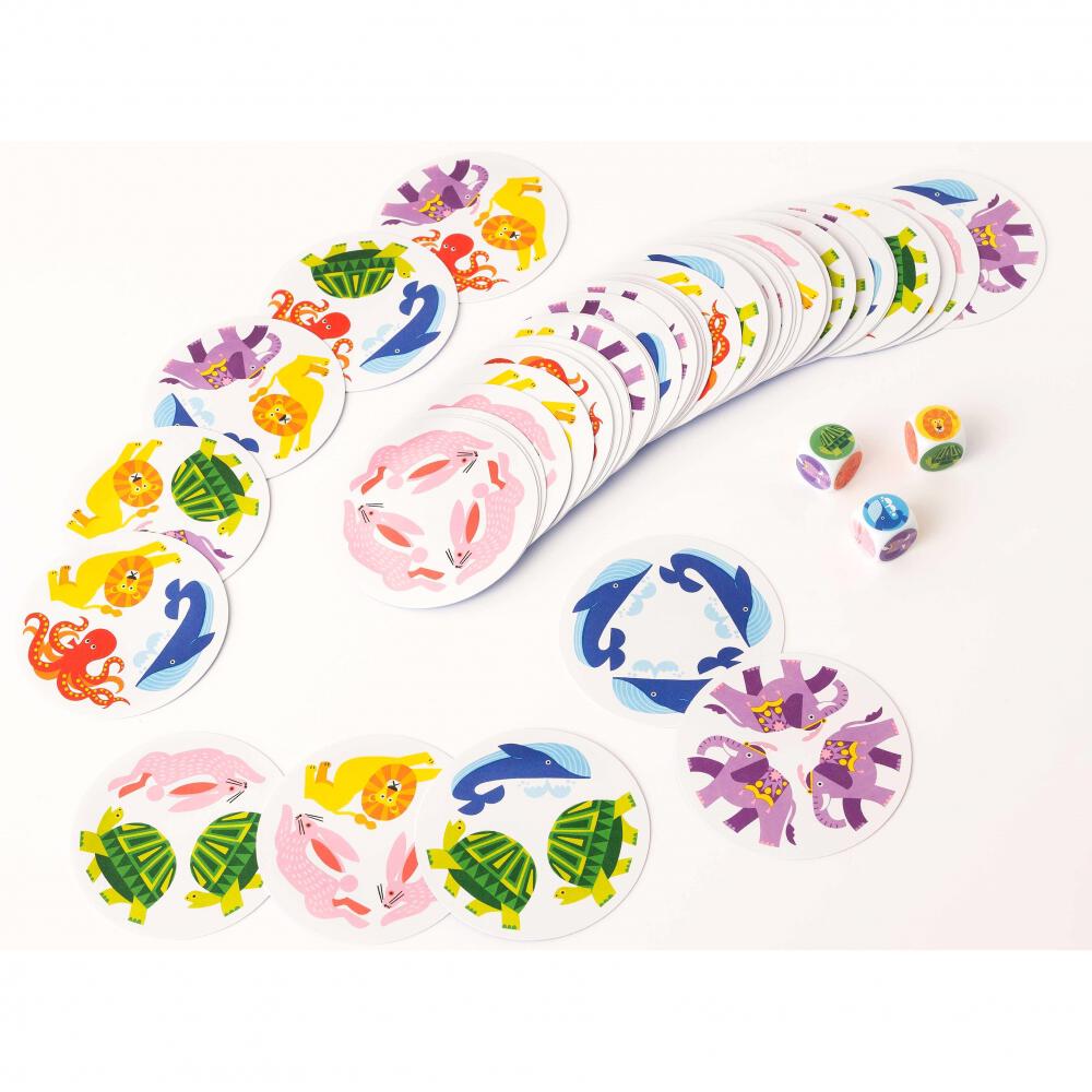 集中力や短期記憶力を養える!6色の動物を見分けて、素早く見つけよう!【遊び方】1,カードの動物が描かれた面を上にして、全て広げます。2,さいころを3つ同時にふります。 全員で、出た目の動物が描かれているカードを探します。3,一番早く見つけられた人がカードをゲット! カードを最も多くゲットした人が勝ち。【セット内容】カード56枚、シール台紙、さいころ3個、あそびかたガイド 【対象年齢】3歳以上 【プレイ人数】2人~【プレイ時間】約15分