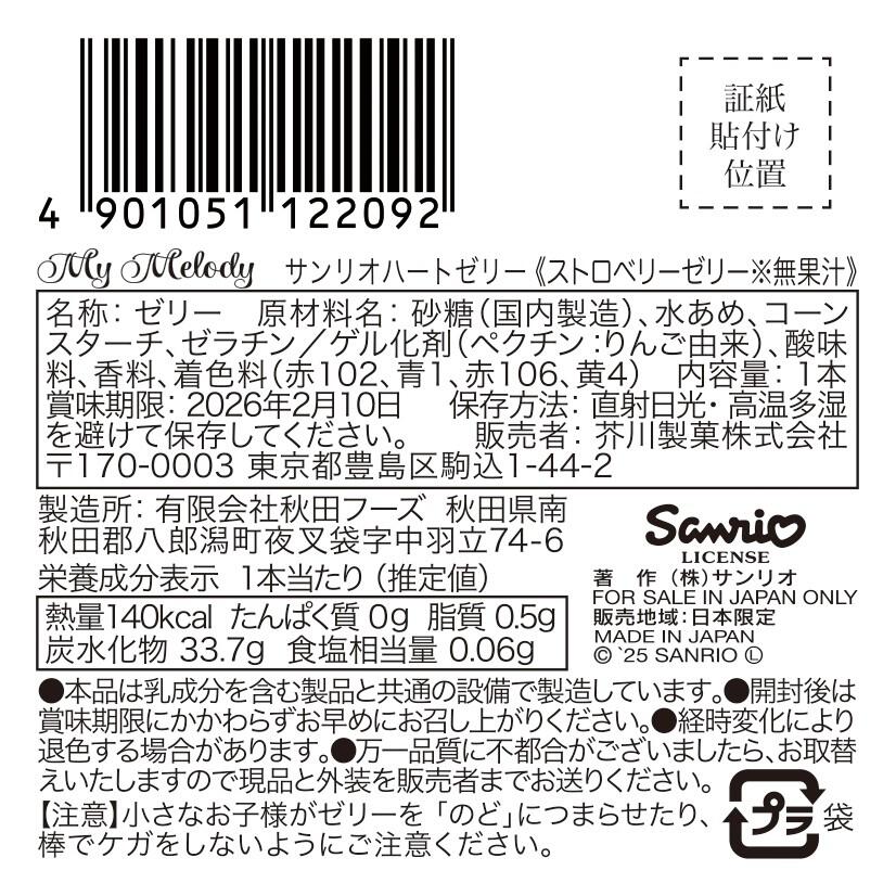 【マイメロディ】砂糖(国内製造)、水あめ、コーンスターチ、ゼラチン/ゲル化剤(ペクチン:りんご由来)、酸味料、香料、着色料(赤102、青1、赤106、黄4)