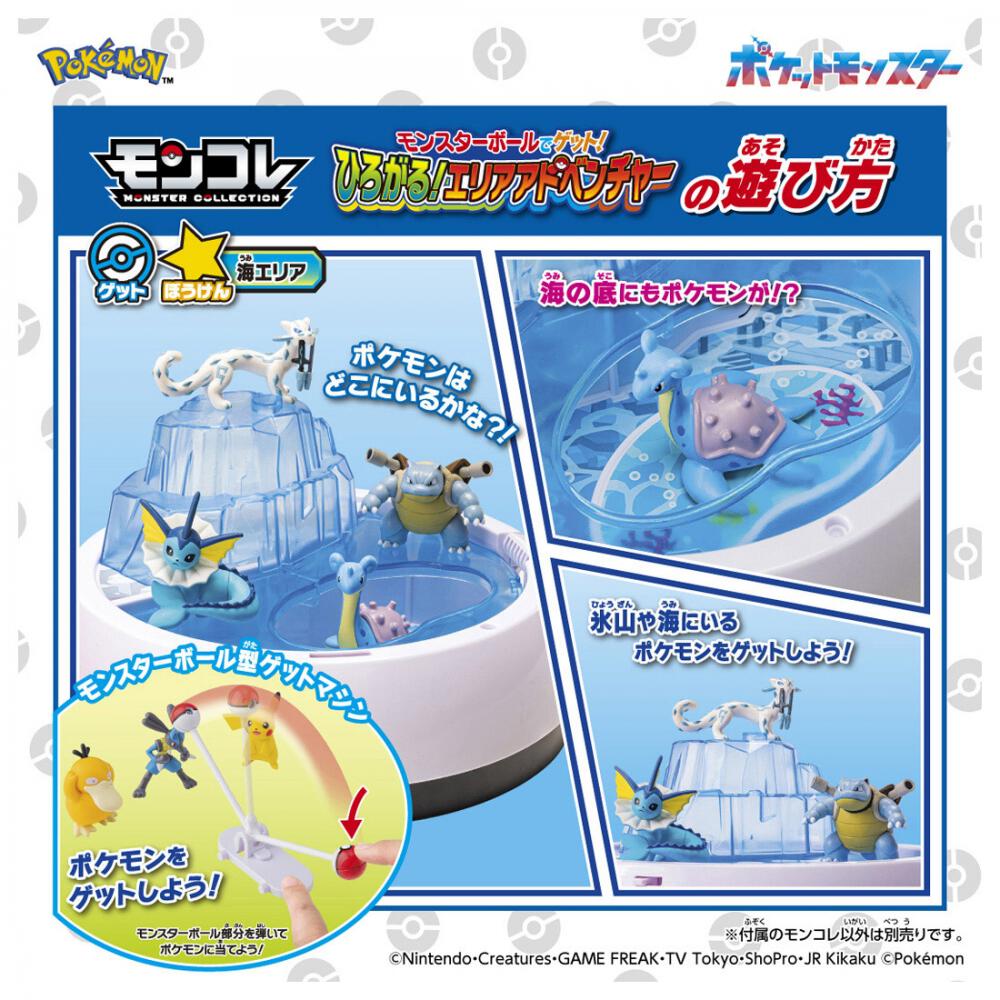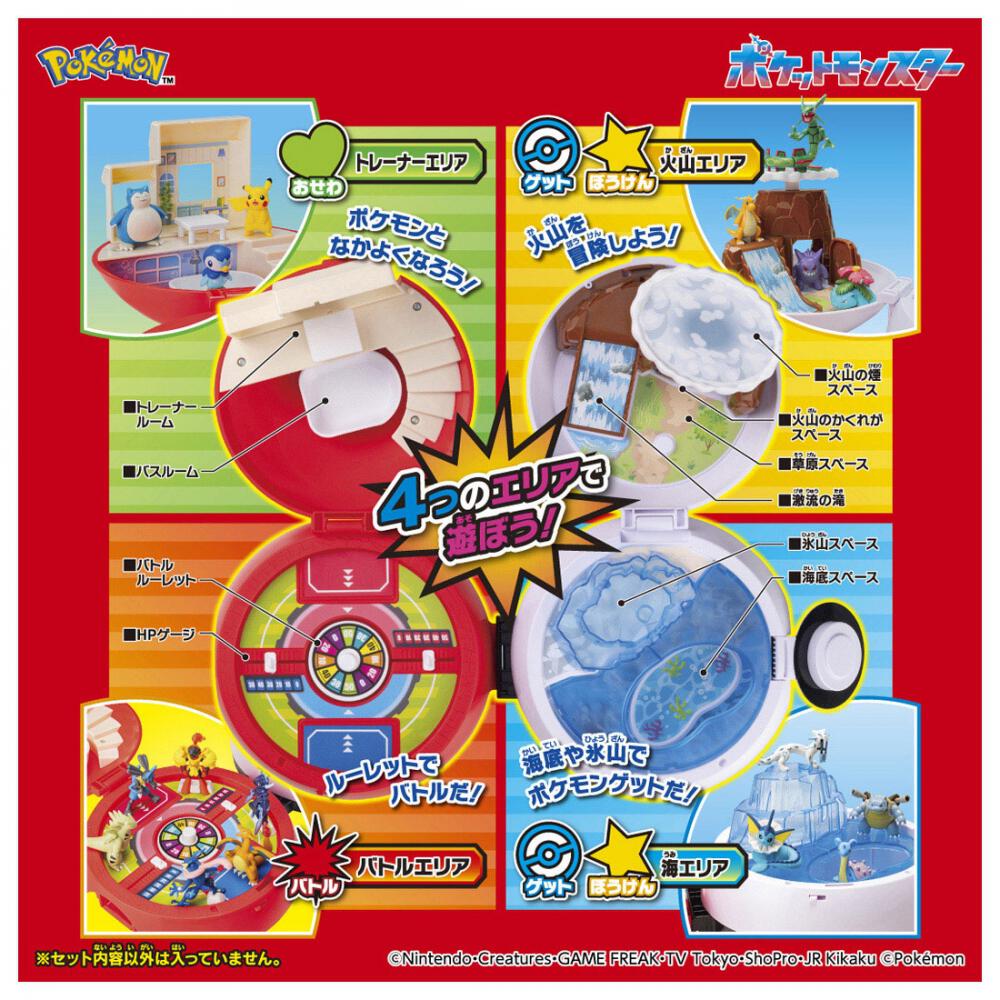 4つのエリアでぼうけん・ゲット・バトル・おせわ4つのあそびがたのしめる!モンスターボール型本体をひろげると4つのエリアが出現!