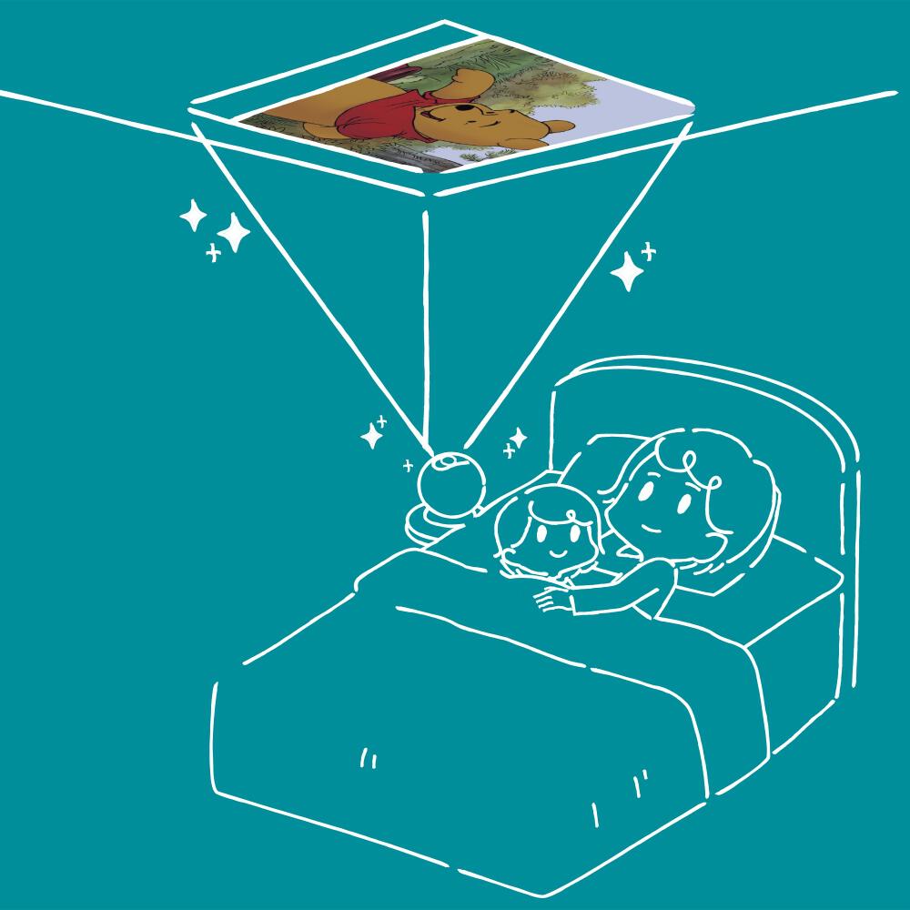 寝室で寝そべりながら、天井に大きく投影される「おはなし」や「まなび」のコンテンツを通して、心と頭を育みます。