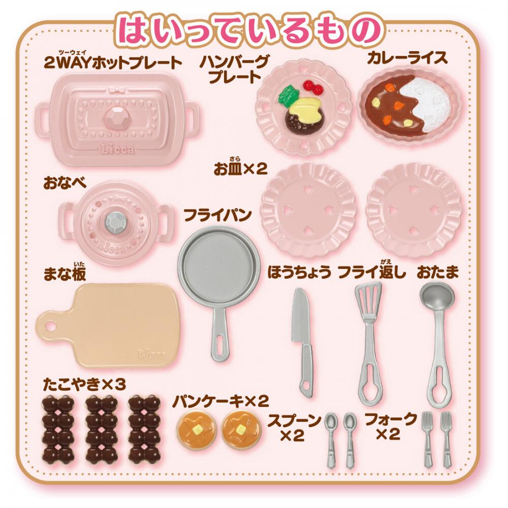 <セット内容>2WAYホットプレート(鉄板プレート、フタ含む)(1),おなべ(フタ含む)(1),フライパン(1),まな板(1),お皿(2),カレーライス(1),ハンバーグプレート(1),たこやき(3),パンケーキ(2),小物ランナーパーツ(おたま、フライ返し、ほうちょう、スプーン×2、フォーク×2) (1),