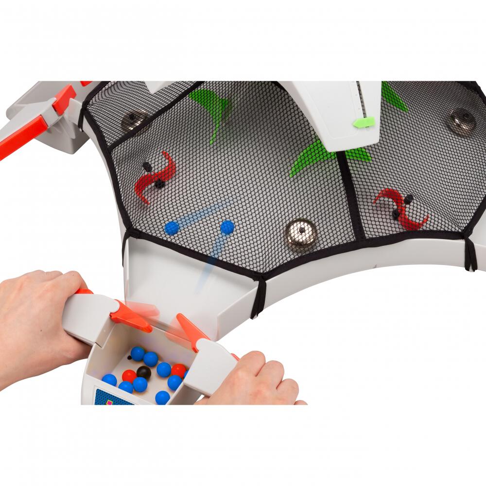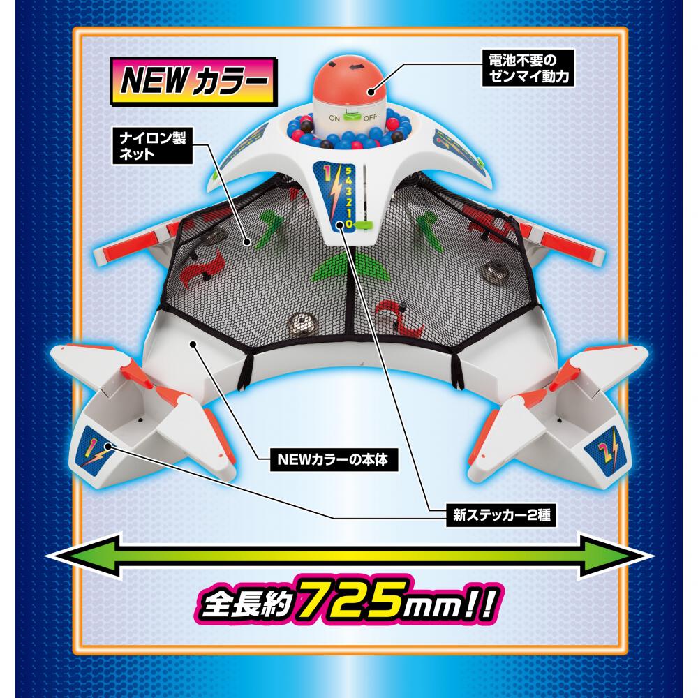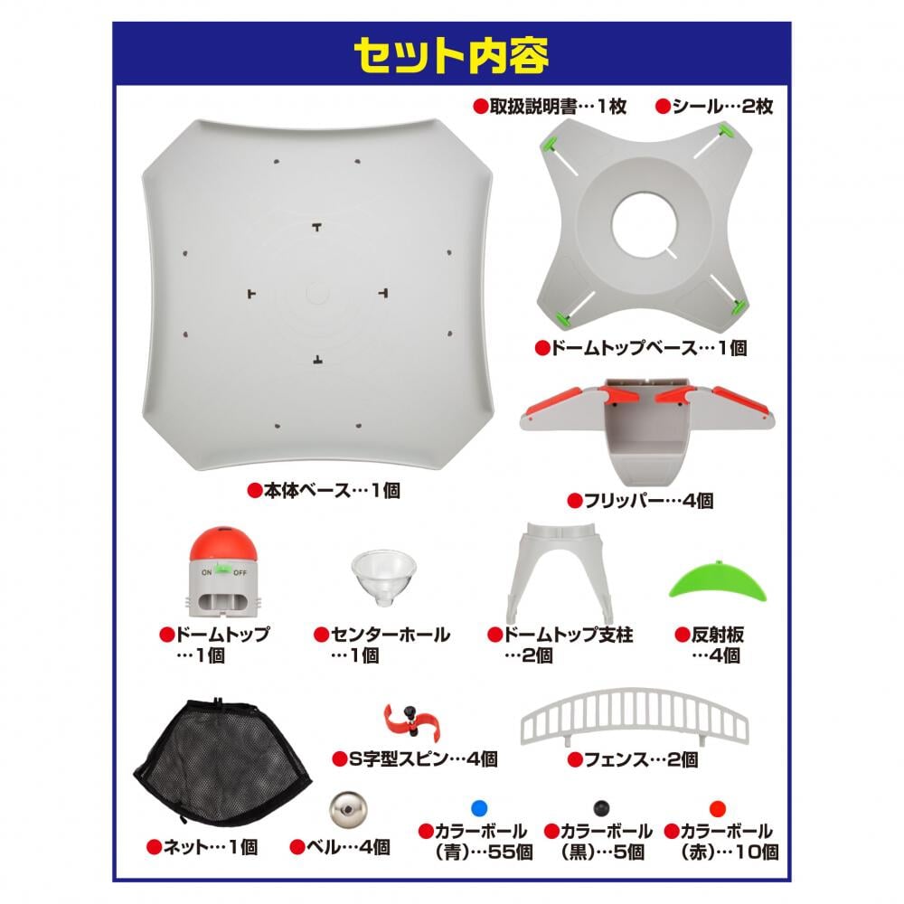 ・本体ベース…1個 ・フリッパー…4個 ・ドームトップ…1個 ・ドームトップベース…1個・ドームトップ支柱…2個 ・センターホール…1個 ・反射板…4個 ・ネット…1個・ベル…4個 ・S字型スピン…4個 ・カラーボール(青)…55個 ・カラーボール(黒)…5個・カラーボール(赤)…10個 ・フェンス…2個 ・シール…2枚 ・取り扱い説明書