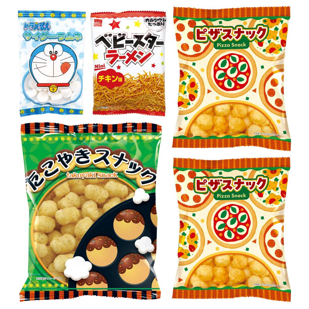 たこやきスナック30g、ベビースターラーメンチキン味21g、ピザスナック20g(2袋)、ドラえもんサイダーラムネ18g