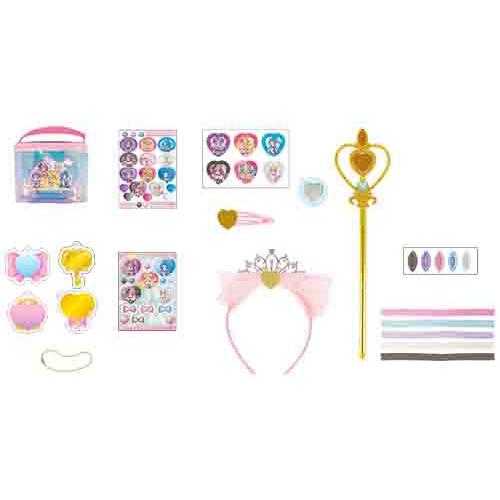 【内容】ステッキ:1個/ティアラつきカチューシャ:1個 /バニティポーチ:1個 /パッチンピン:1個 /アクリルチャーム:形状4種×各1個 合計4個 /ボールチェーン:6本 /リボン:5色×各1本 合計5本 /ホログラムシール:1シート /ぷっくりシール:1シート /キャラクターストーンシール:6柄×各1個 合計6個/ストーンシール:5色×各1個 合計5個