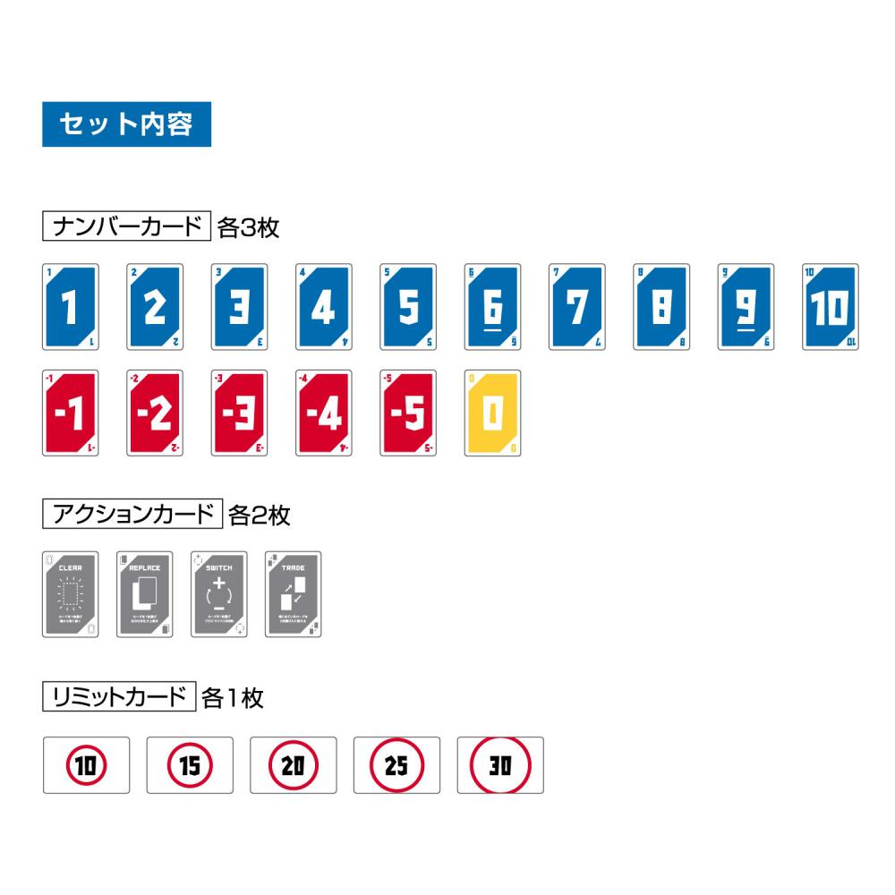 <セット内容>ナンバーカード×48、リミットカード×5、アクションカード×8、遊び方説明書×1